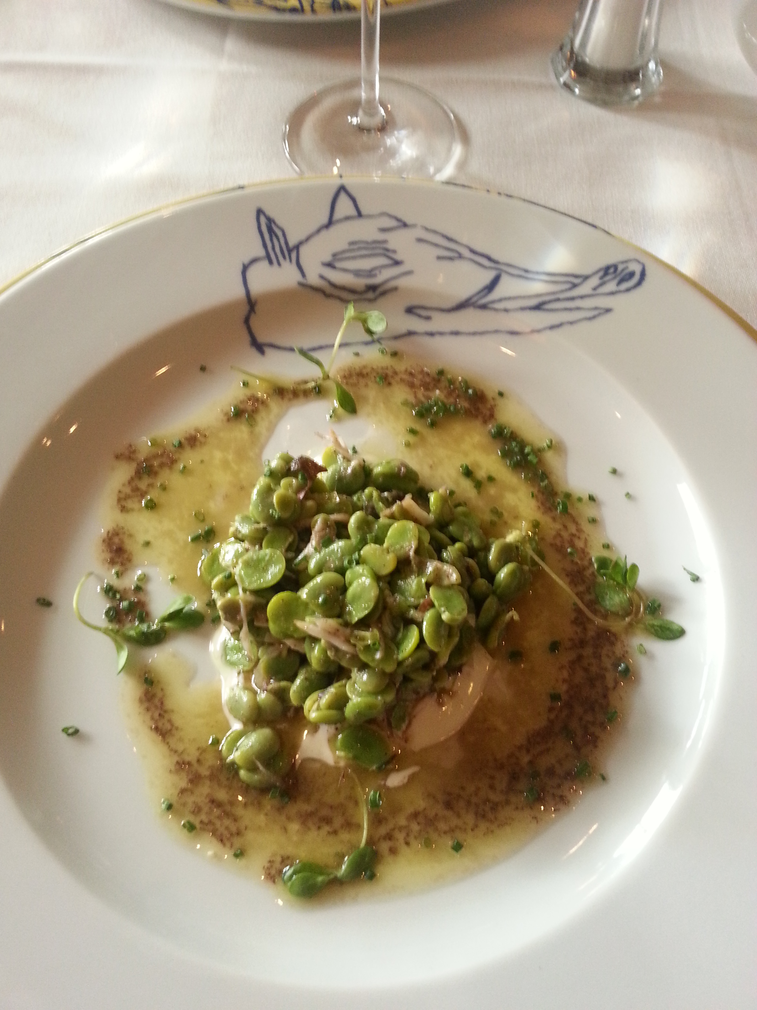 El siguiente entrante también fue fabuloso, la ensalada de habitas con carne de cangrejo. También con alguna coruga que se había escapado del plato anterior. Las habas tiernas y sabrosas, y la carne de cangrejo que le da un toque diferente pero sin quitar sabor ni relevancia a las habas. El aliño llevaba un toque cítrico suave que contrastaba genial con el resto.