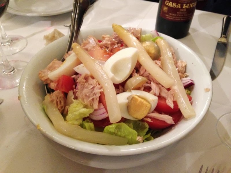 Luego ya en la mesa pedimos unos entrantes y un plato para cada uno. De primero una ensalada de la casa, bien hermosa y bien aliñada. En Lucio es bueno hasta el pan, en forma de rosca, de toda la vida.