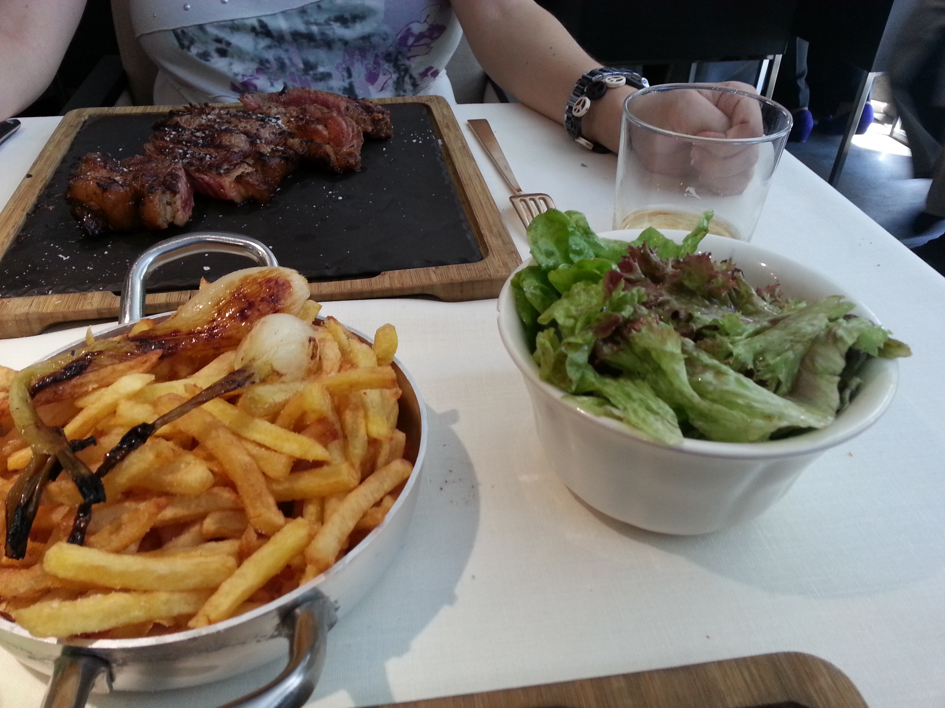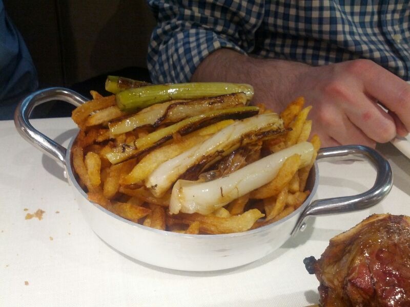 He comido mucha chuleta en mi vida y creo que nunca había visto nada igual. Un espectáculo de color y sabor, perfectamente en su punto. Realmente para llorar del gusto. Todas las carnes vienen acompañadas de patatas fritas y cebolletas, y una ensalada muy rica y bien aliñada. La carne sola está exquisita, pero bien acompañada es un manjar de dioses.