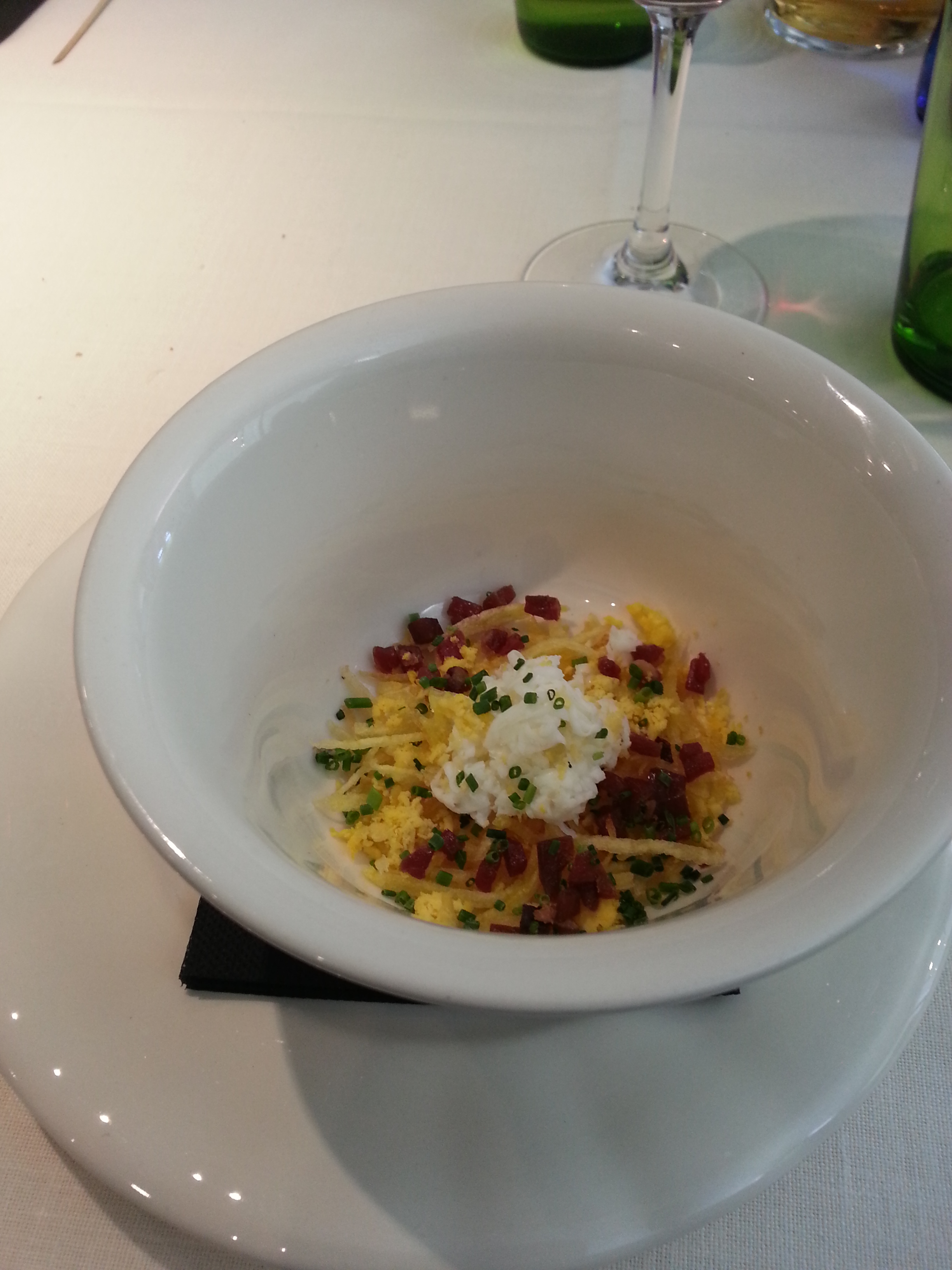 El otro entrante fue el huevo a baja temperatura con parmentier de trufa. Fue una triunfada de plato. Quizá para tres supo a poco, pero lo disfrutamos muchísimo. Va el huevo sobre la crema de patata y trufa, y con ese pan magnífico que nos pusieron nos liamos a untar como descosidos hasta que no quedó nada.