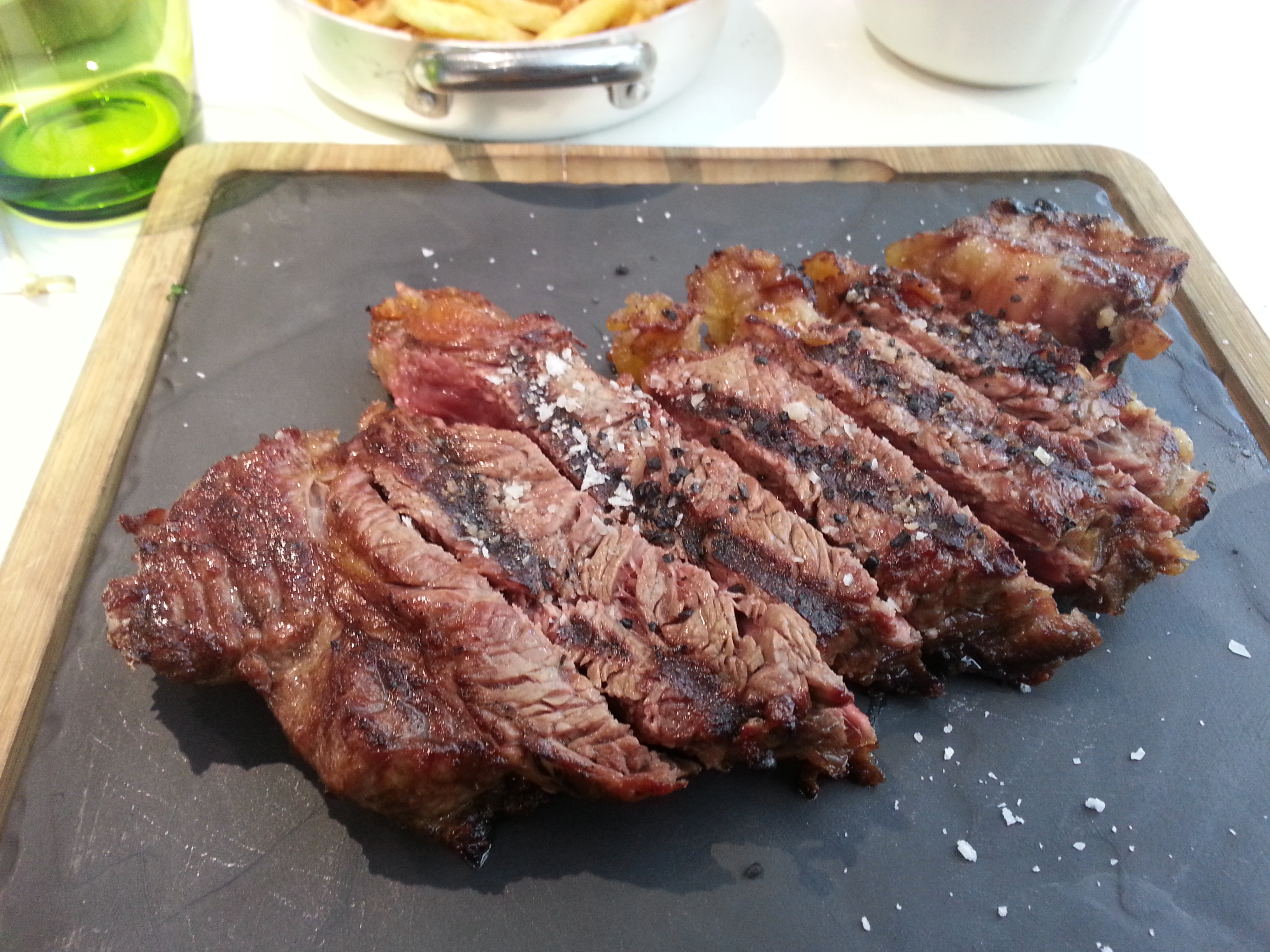 Y de ahí a «nuestra carne». Nosotros no optamos por el chuletón, sino por un par de entrecotes de ternera rubia gallega. Carne limpia de unos 450 gr cada pieza. Primero, te presentan las piezas en crudo para que des tu visto bueno. La foto no es una maravilla pero aquí tenéis el antes. Escasísima grasa y un color sobresaliente.