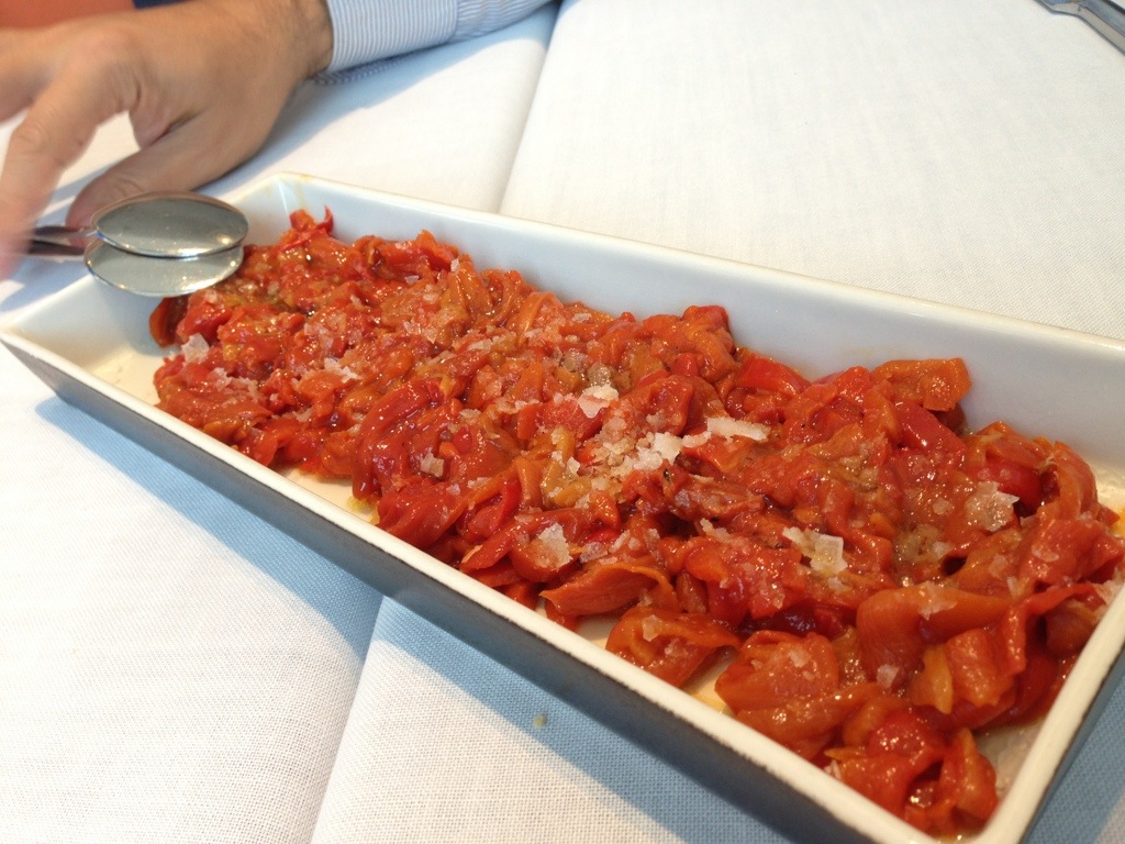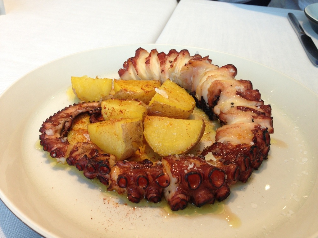 Los pimientos muy ricos pero no eran más que eso, pimientos rojos con lascas de sal crujiente. Un poco de ventresca les habría subido el ánimo, u la verdad es que por 20€ es de esperar. El pulpo muy bueno, a mi me pareció o mejor que probé, entre jugoso y crujiente por fuera en algunas partes. Y la ensaladilla buena, con buen aceite pero mucha patata. Se podía pedir con caviar de trufa en lugar de ventresca.