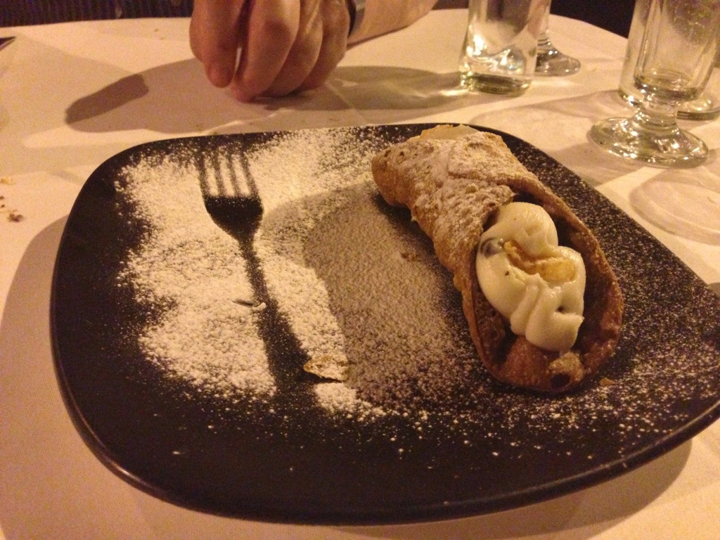 De postres tiramisu y cannolosiciliano. Yo he tomado el cannolo y me ha parecido riquísimo. Es una crema con ricotta dentro de un tubo de hojaldre durito, espolvoreado en azúcar. Un éxito.