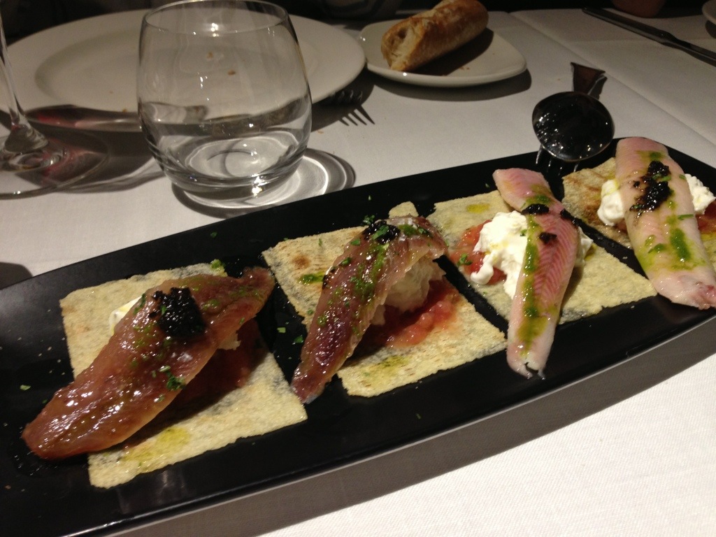 Lo primero que probamos fueron estos pinchos de lomos de anchoa y de sardina ahumada, con tomate y burrata. Si esto no son unos buenos filetes no sé lo que son. Qué luzajo de canapés.