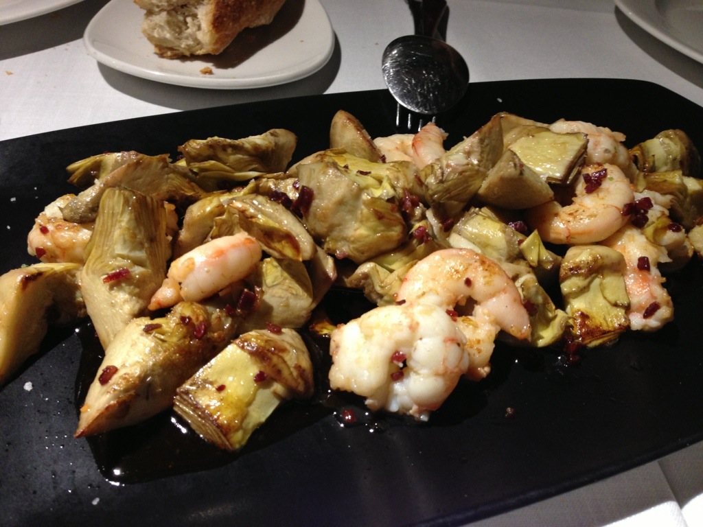 Después las alcachofas salteadas con cigalas. Otro espectáculo de plato, sencillo pero bordado.