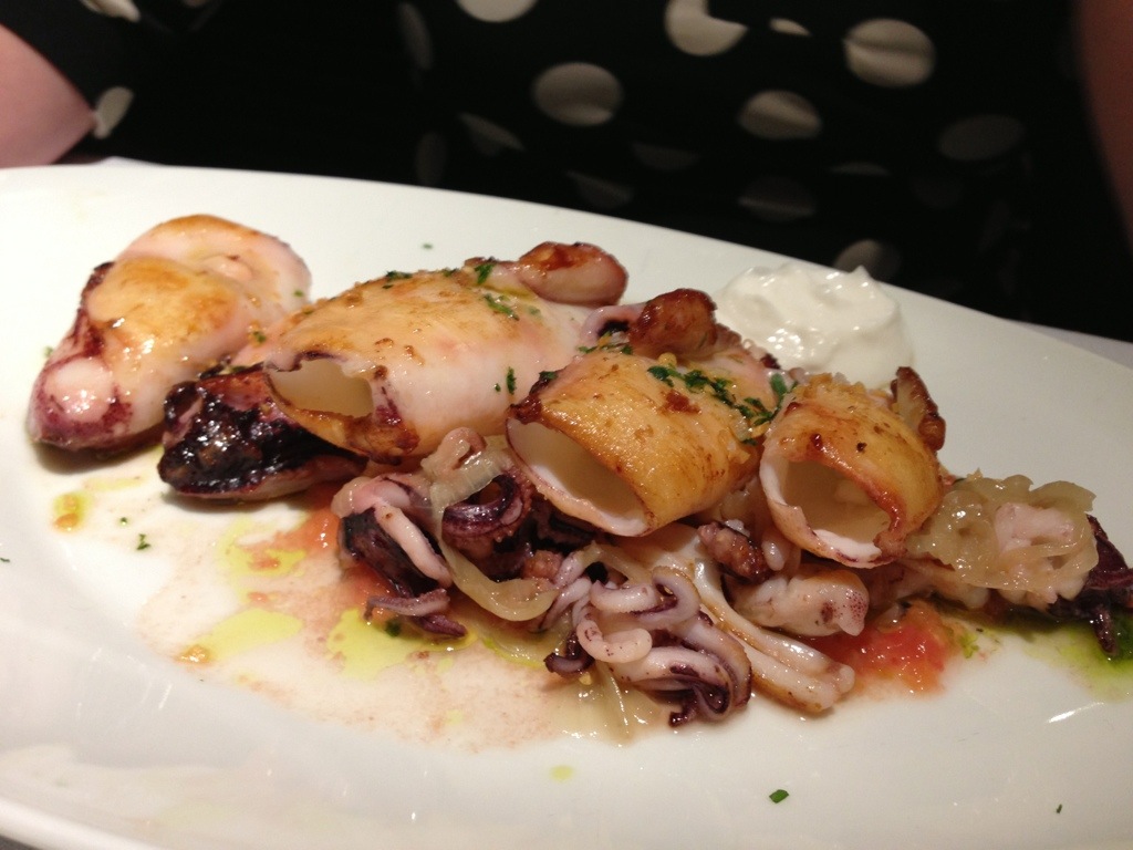 Probamos también los chipirones a la plancha, con ajito, cebolla confitada y un alioli de almendra. Ya podéis ver en la foto la pintaza que tenían. Cuando he dicho que en esta Taberna pueden fardar de producto no iba en broma.