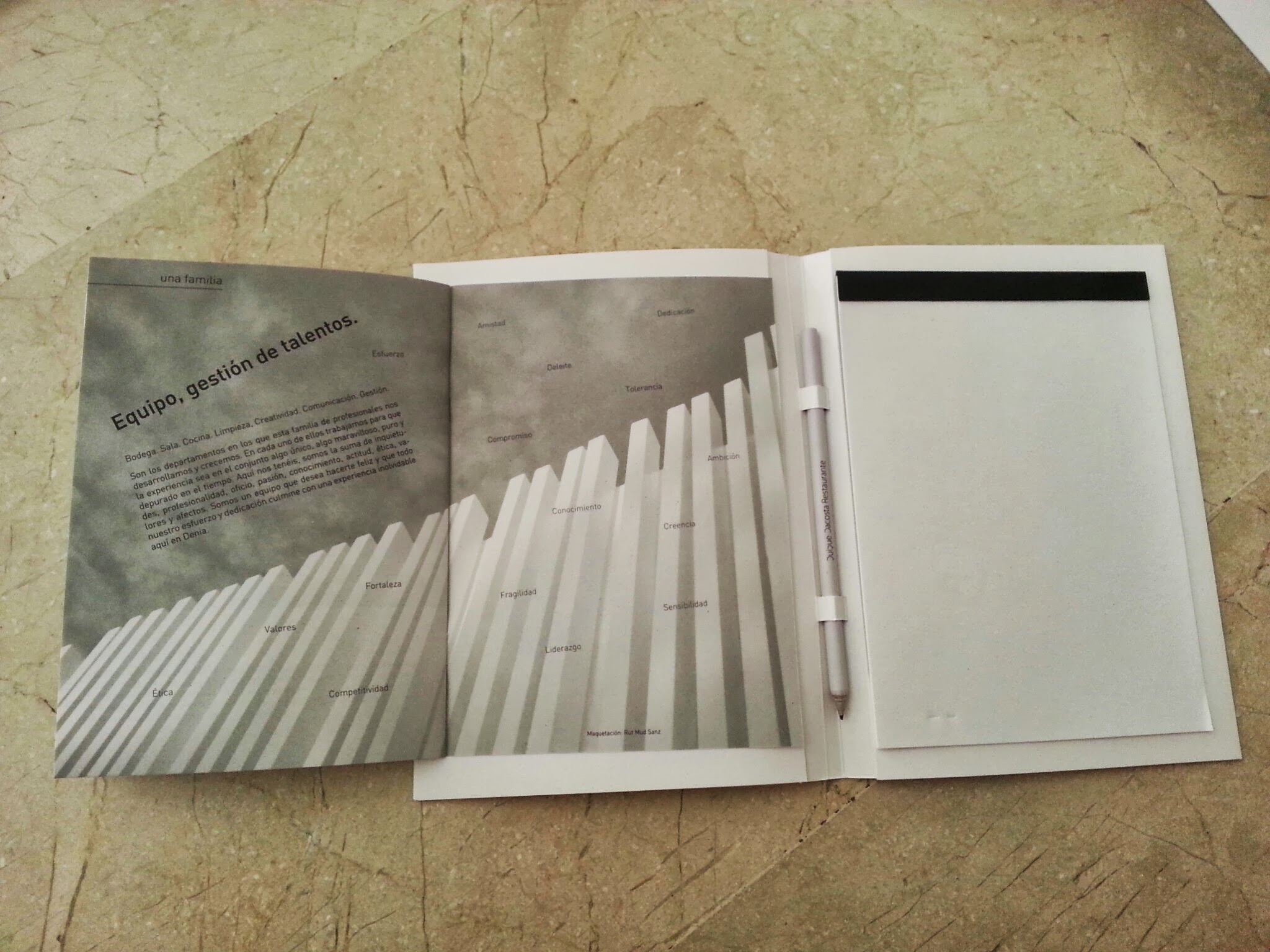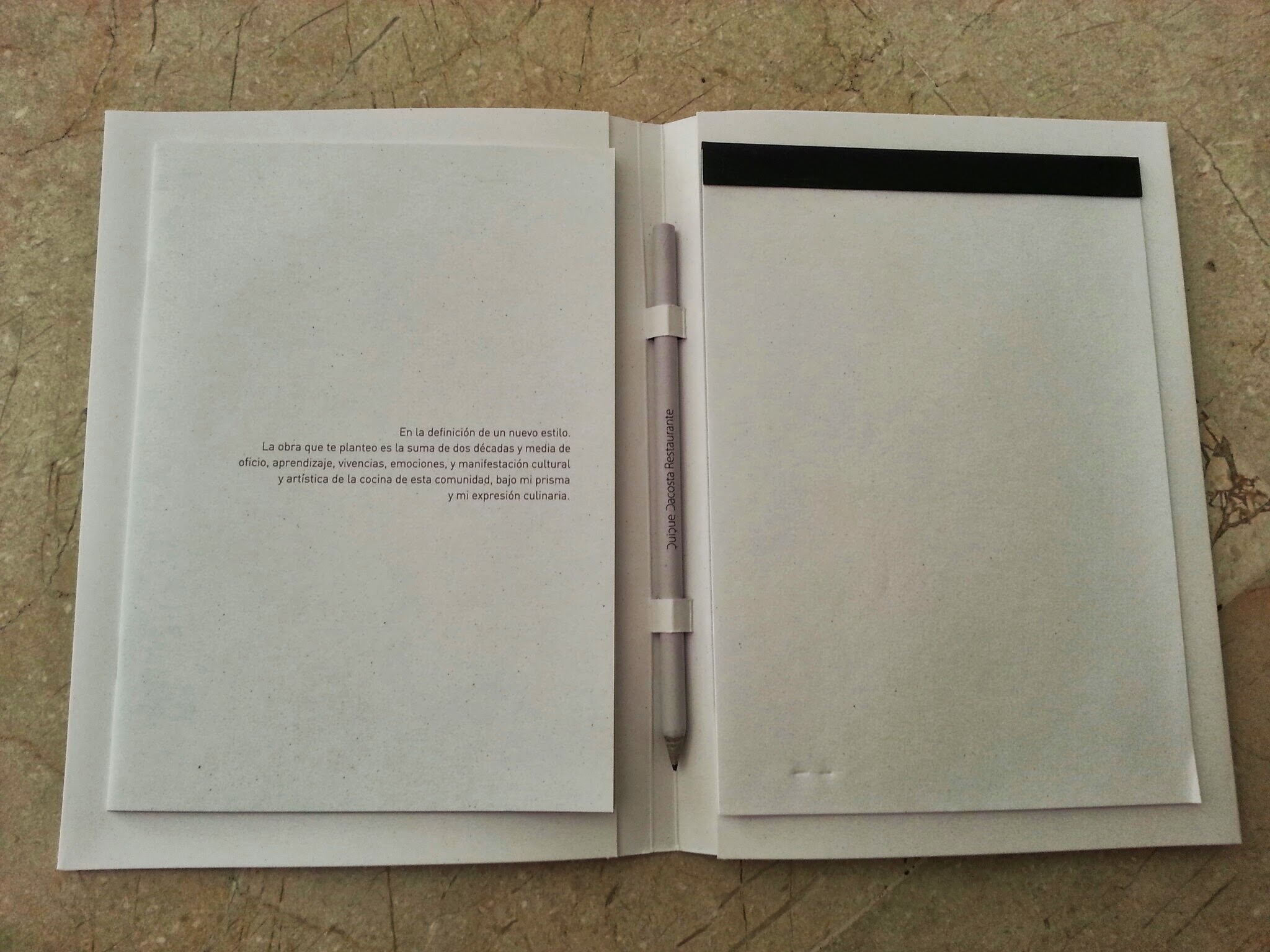 Al llegar, comienzas con los snacks en la zona de terraza. Eliges el sitio disponible que más te plazca y te acomodas antes de que te traigan el welcome pack. Es la primera vez que veo algo así y me parece una idea de 10. Consiste en una carpeta con los menús en un sobre, una intro curradísima del restaurante y su equipo, y tu libreta para tomar notas. Vamos que no te vas a aburrir. Chapó!!