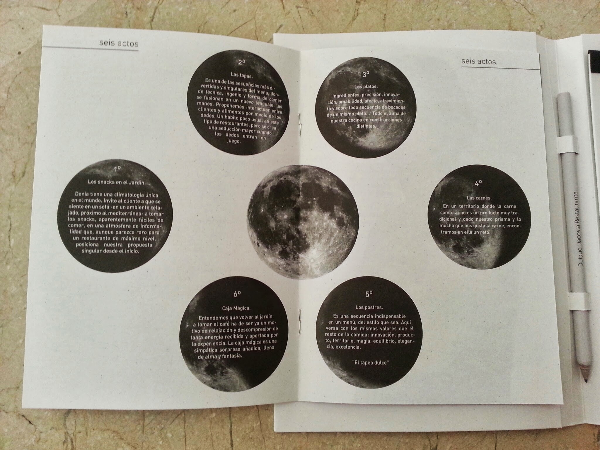 Y aproximándonos ya al momento de la verdad, sólo mencionar que en el restaurante de Quique Dacosta, hay dos menús degustación. El primero es Universo Local donde vas a encontrar los platos más representativos de la trayectoria del restaurante. El segundo es Made in the Moon y está confeccionado con las novedades del 2013. Al ser nuestra primera visita, nos decantamos por el primero y ahora os vamos a intentar contar las sensaciones irrepetibles que nos dejó a lo largo de sus 6 actos (Snacks, Mesa de Salazones, Tapas, Nuestra mesa, Postres, y La Caja Mágica).