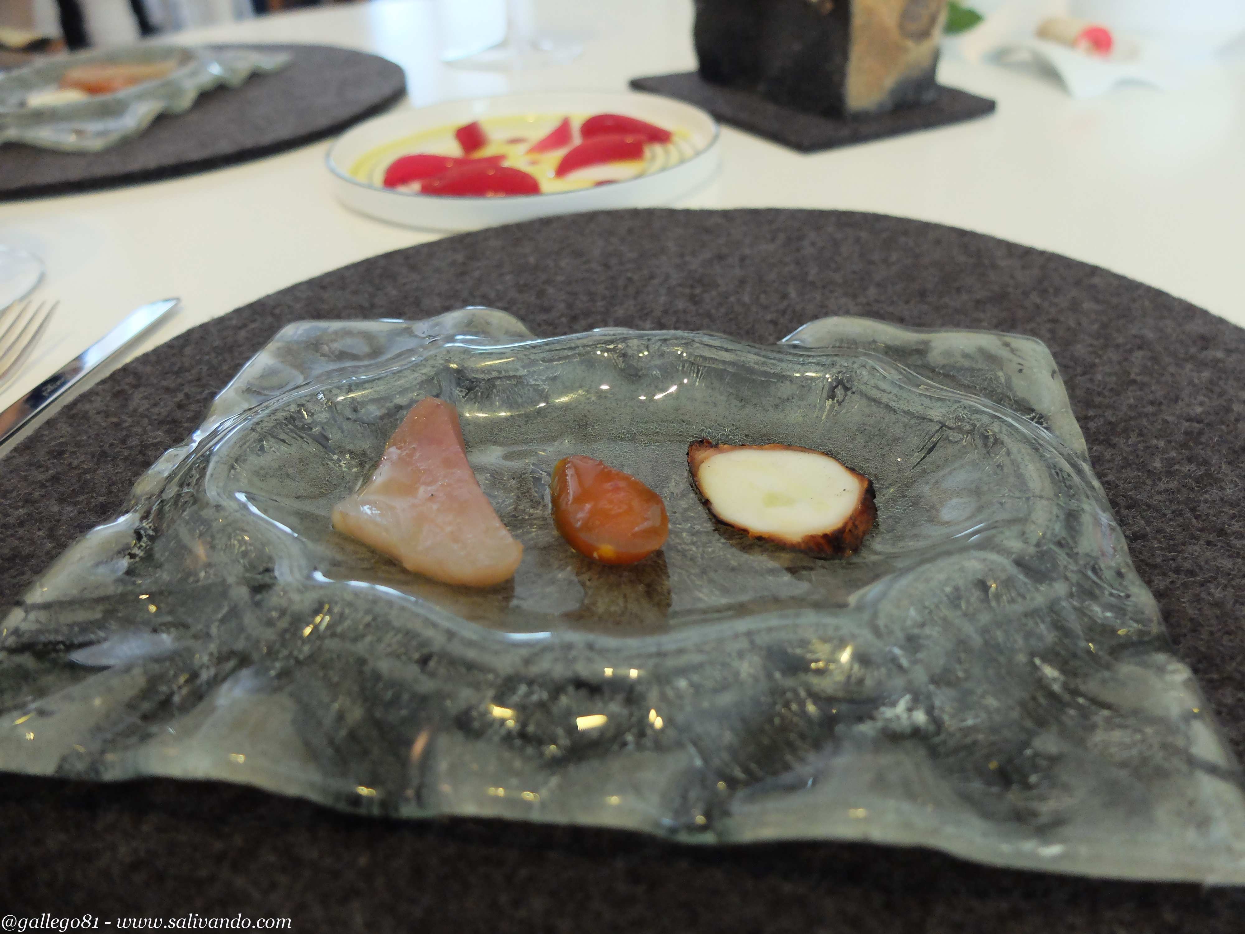 Así que tras los preliminares, ataros los machos porque aquí comenzamos con el carrusel. Son muuuuuchos platos y muchas fotos por lo que voy a intentar ser breve para que esto no se haga eterno. Vaya por delante que el nivel medio de los platos nos pareció de la leche. Brutal. Sin lugar a dudas es uno de los mejores restaurantes que conocemos, si no el mejor. Aunque está claro que algunos platos nos dejaron con la boca más abierta que otros.