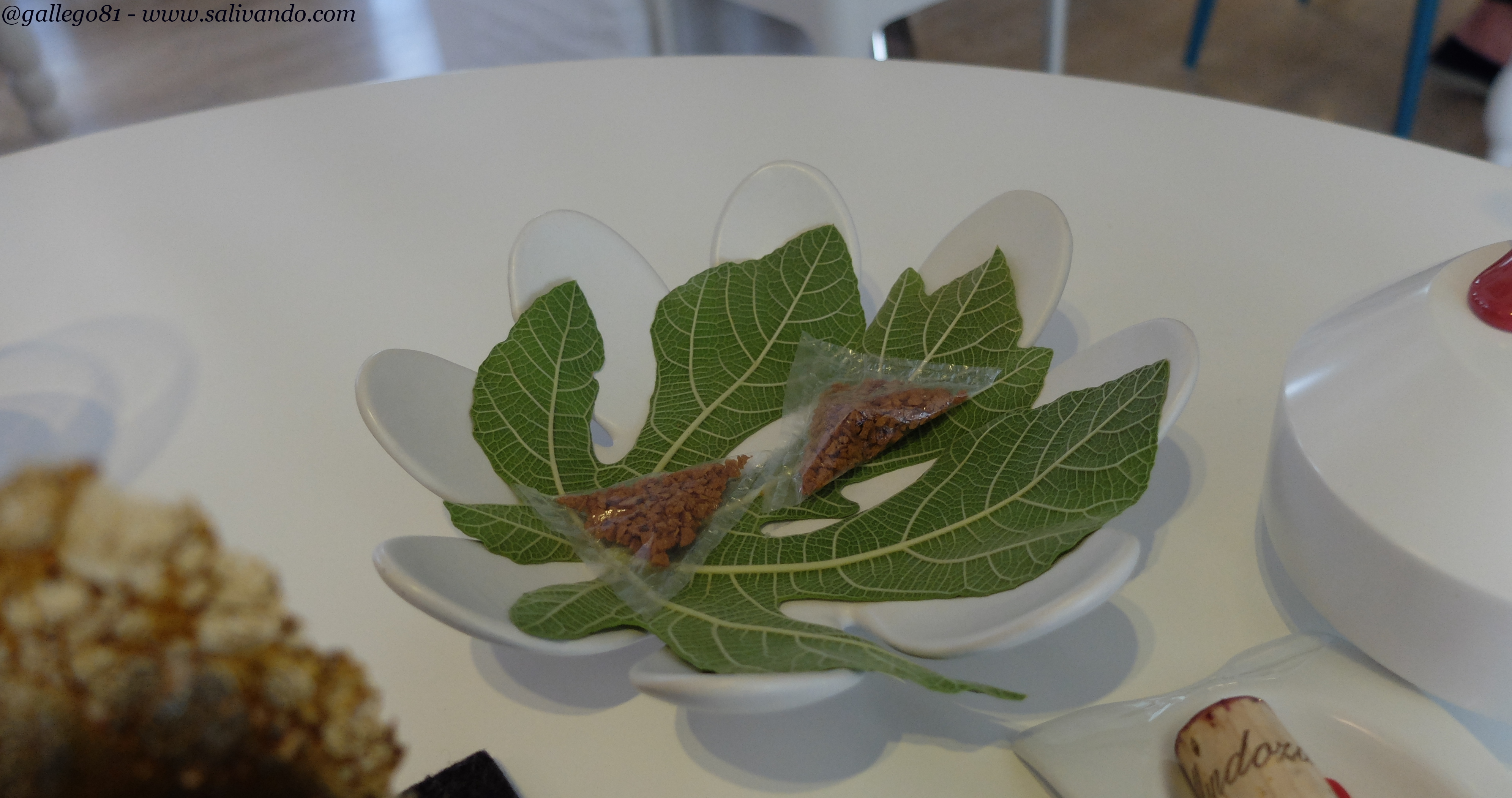 Tras romper el hielo, pasamos a un plato basado en las hojas y ceps de plantas del lugar. Lleva raíces de ceps (marrón en el centro), hoja seca de maiz, hoja de hierbas en escabeche (hoja verde central), hoja de kalachoe con perlas de maracuyá (hojas verdes de los laterales) y hoja de endivia con muselina de naranja (en la parte anterior y posterior del conjunto central). Sí, todo eso viene en el plato y es una mezcla de sabores y texturas divertida y sorprendente.