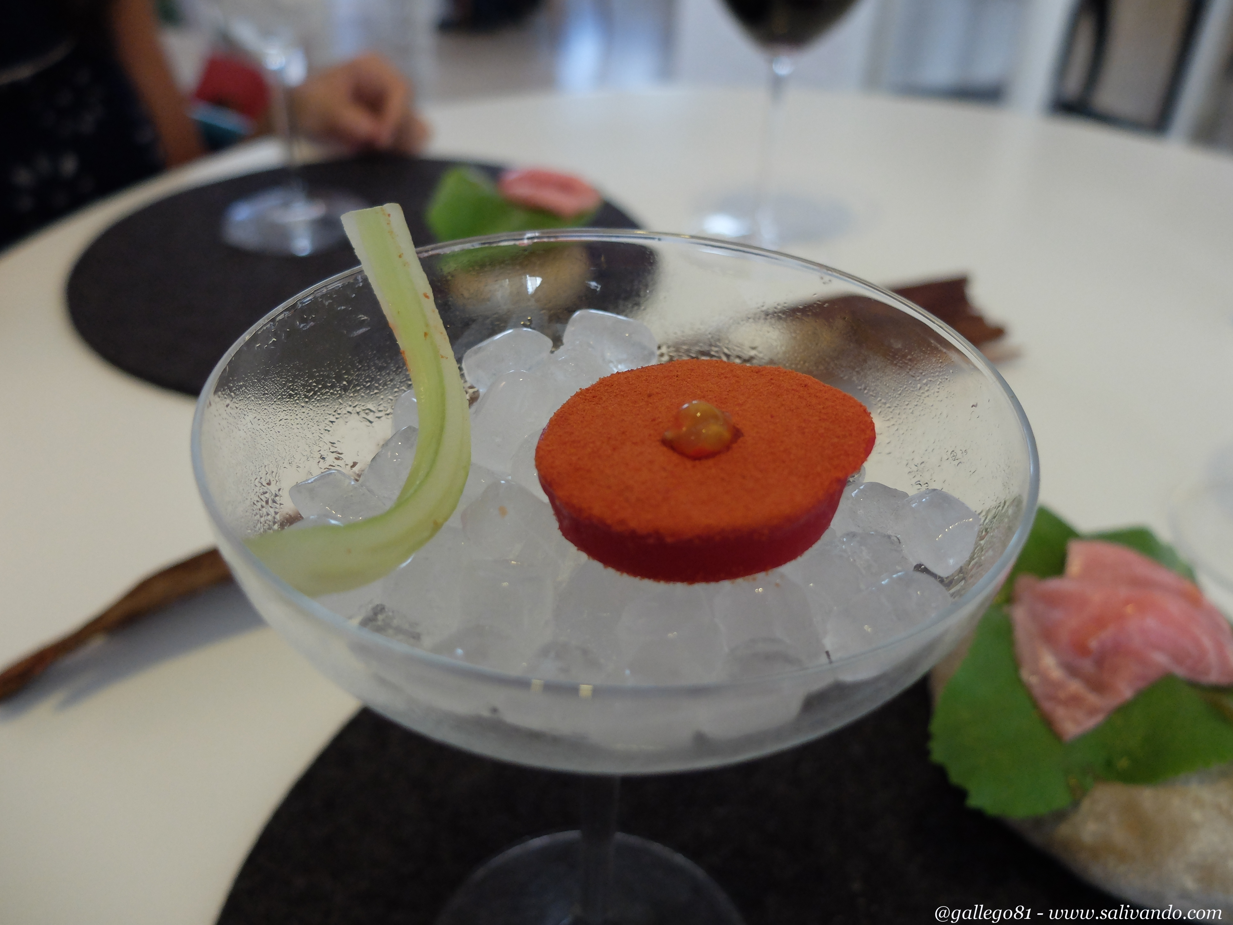 La cosa iba de maravilla y cada vez más y más seria. Ahora venían las tapas. Ya con la primera, María 2012, me dieron en la línea de flotación. Y es que me encantan los bloody maries y la versión Quique Dacosta no se me va a olvidar. Es una especie de «cápsula» que te metes de una en la boca y que una vez dentro se deshace. Una auténtica delicia acompañada de su trozo de apio fresco.