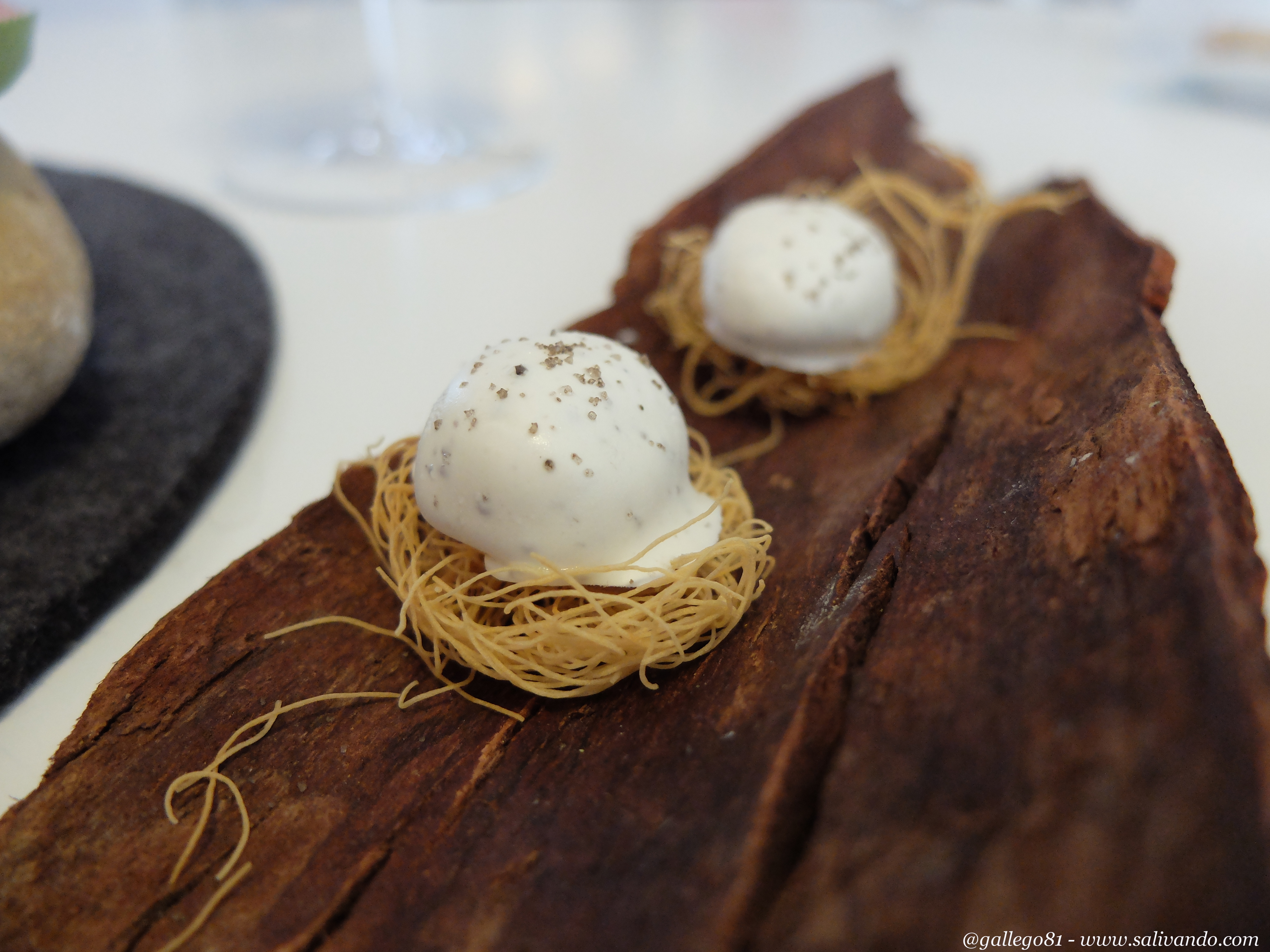 Y en esta mano también tenemos el nido de golodrina. Una esfera de huevo con trufa deliciosa. Para comerse uno detrás de otro.