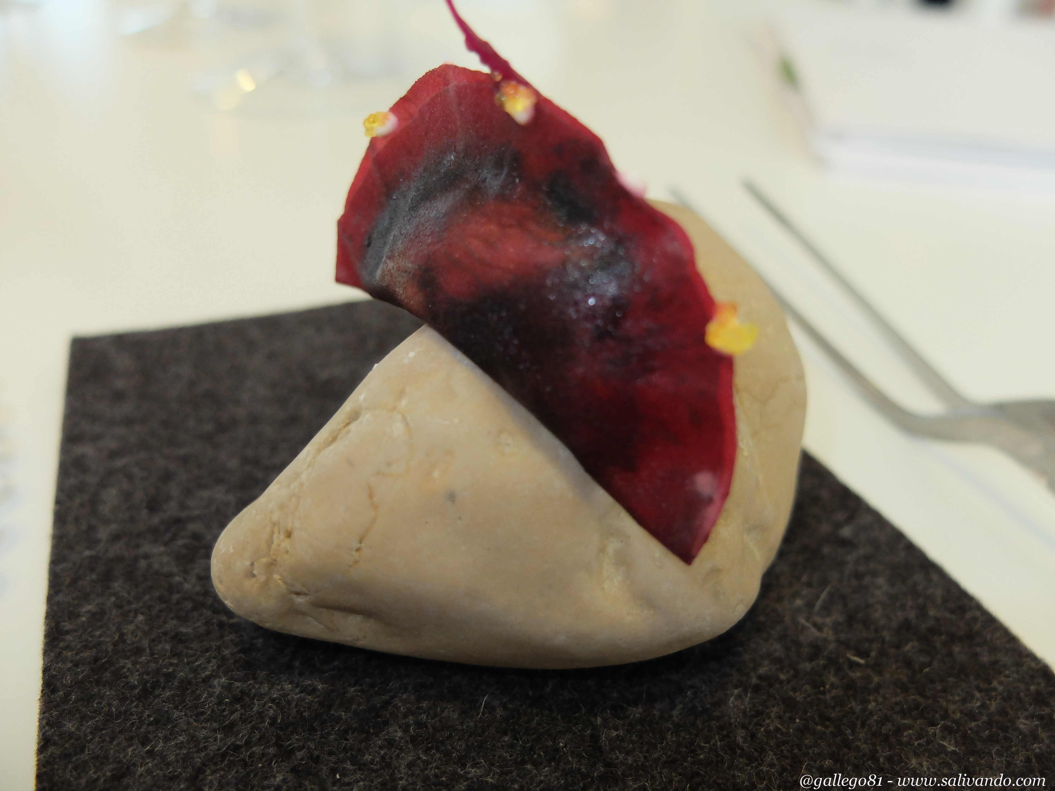Y a la tarta la acompaña una empanadilla de remolacha y cangrejo. Muy buena. Suave sabor a remolacha. Y otra presentación realmente lograda. Como podéis ver, muchos plato vienen casi que en equilibrio sobre piedras. Los camareros podrían valer de equilibristas en el Circo del Sol porque todo llega en su sitio a la mesa.