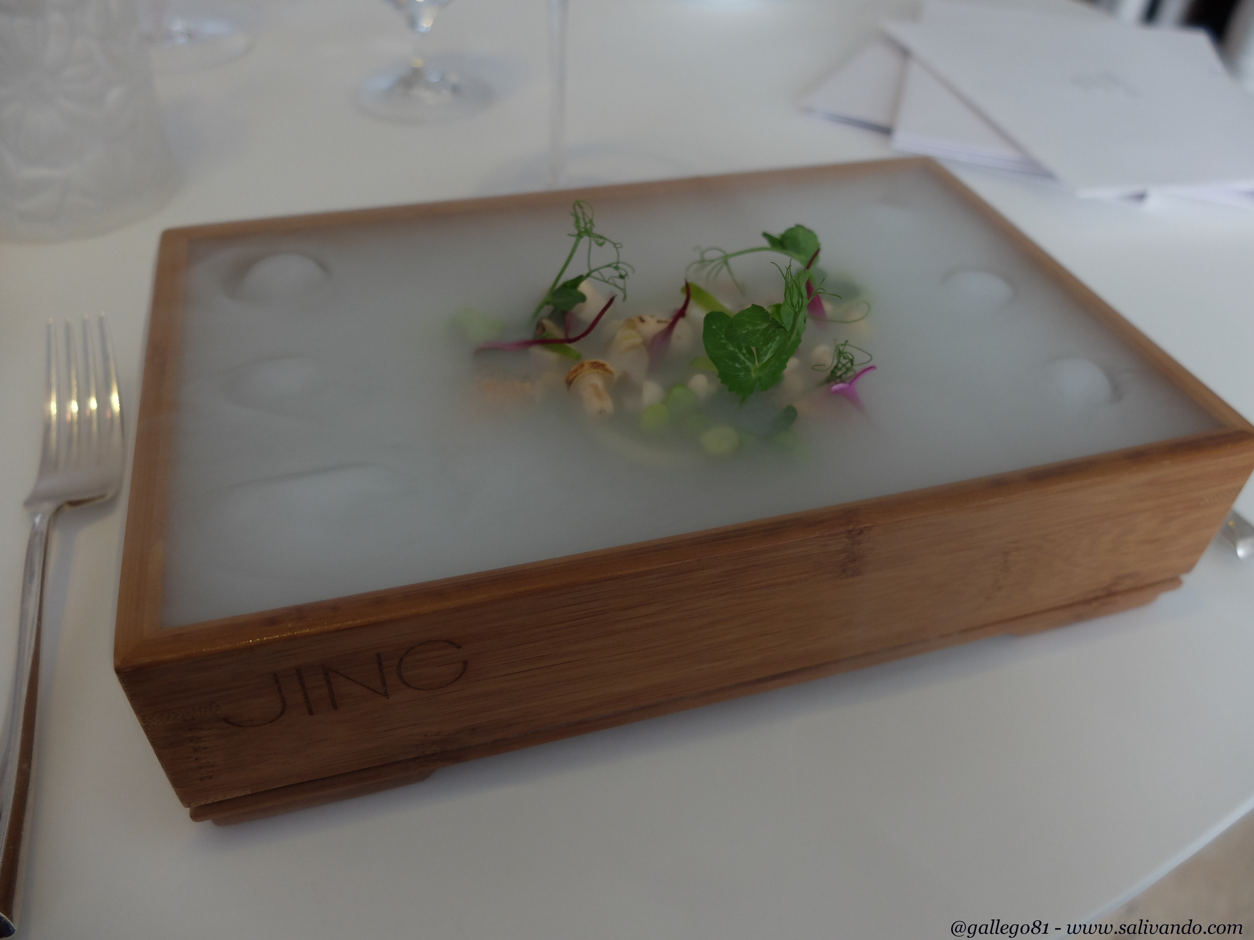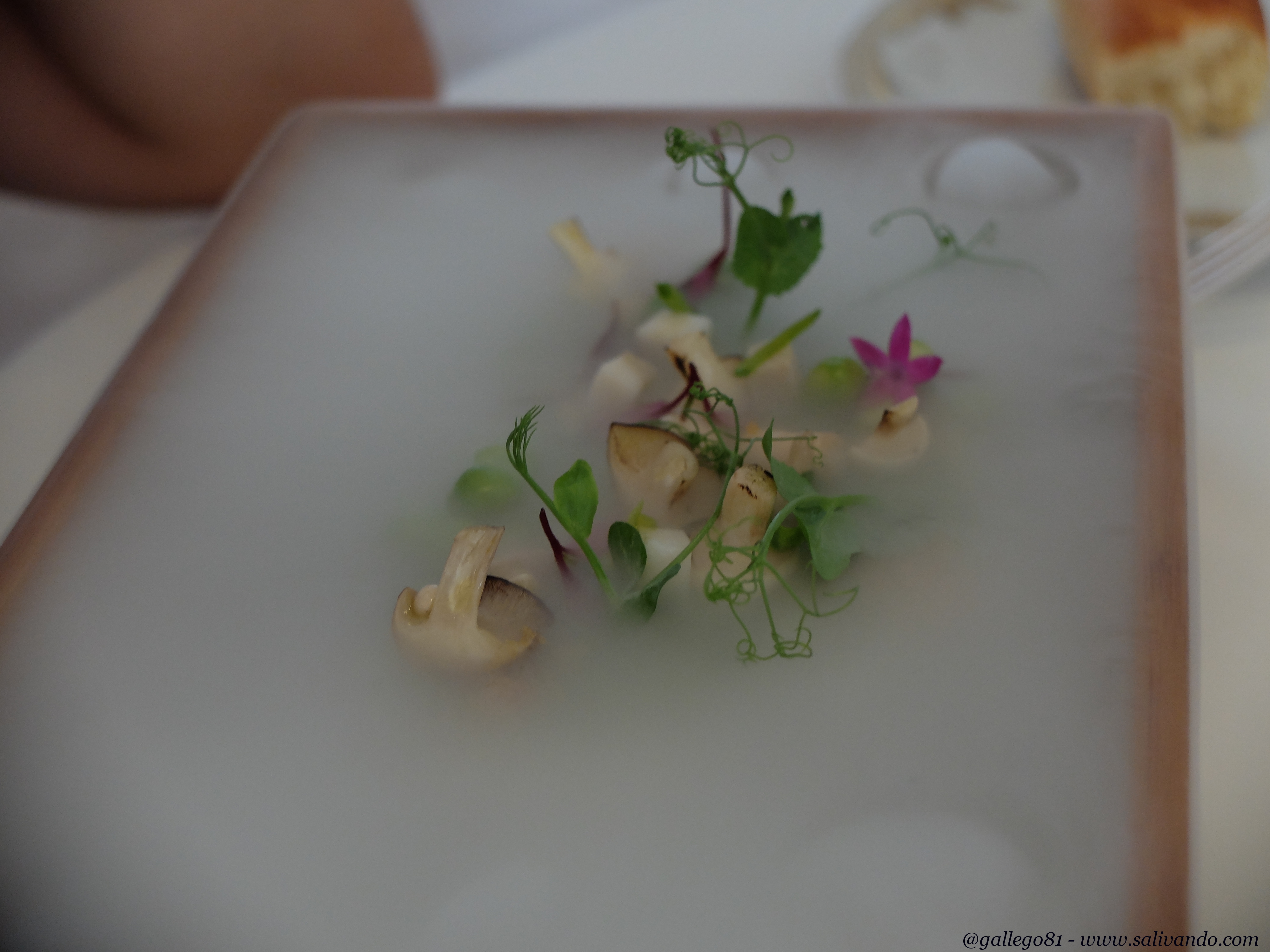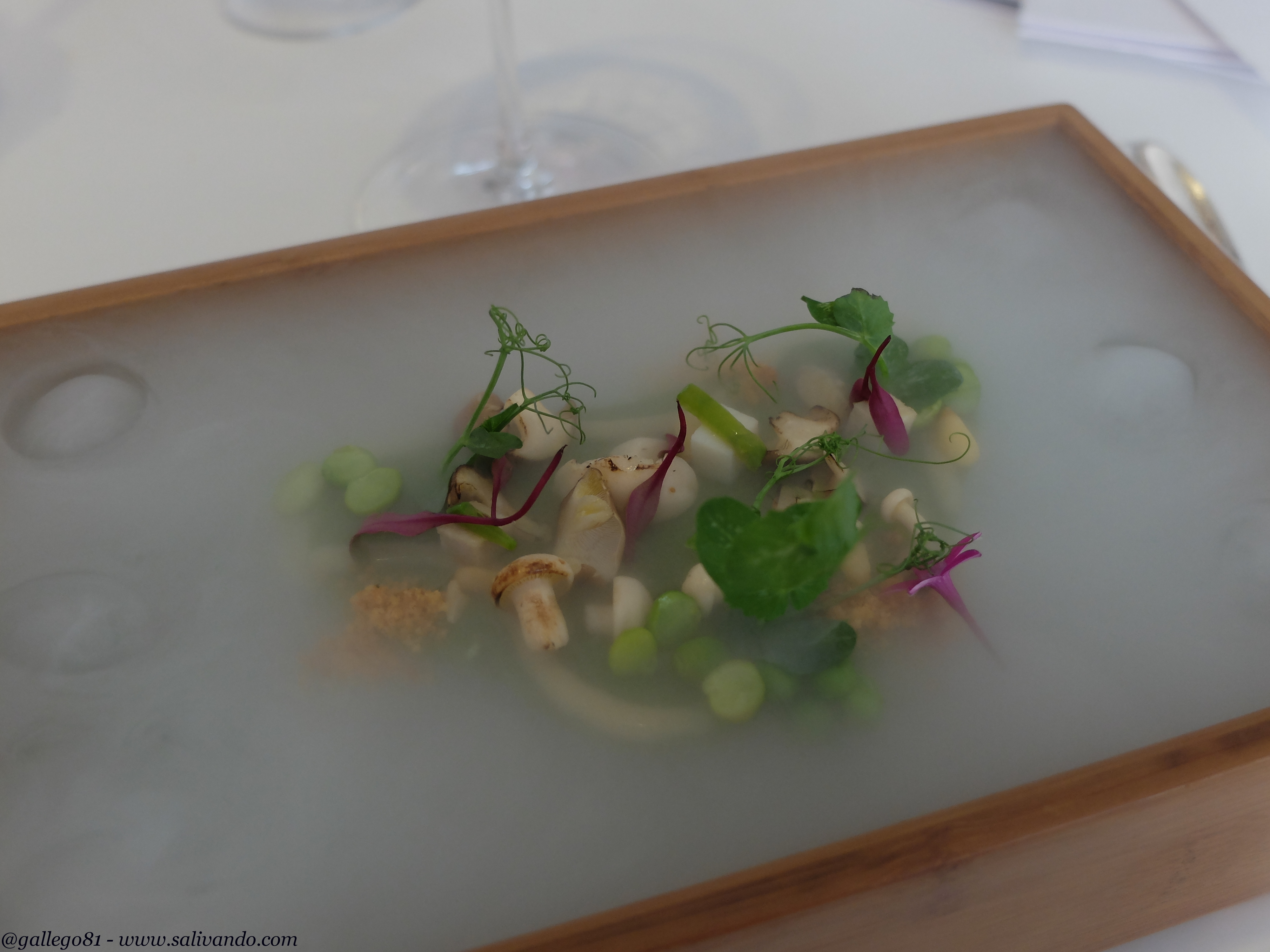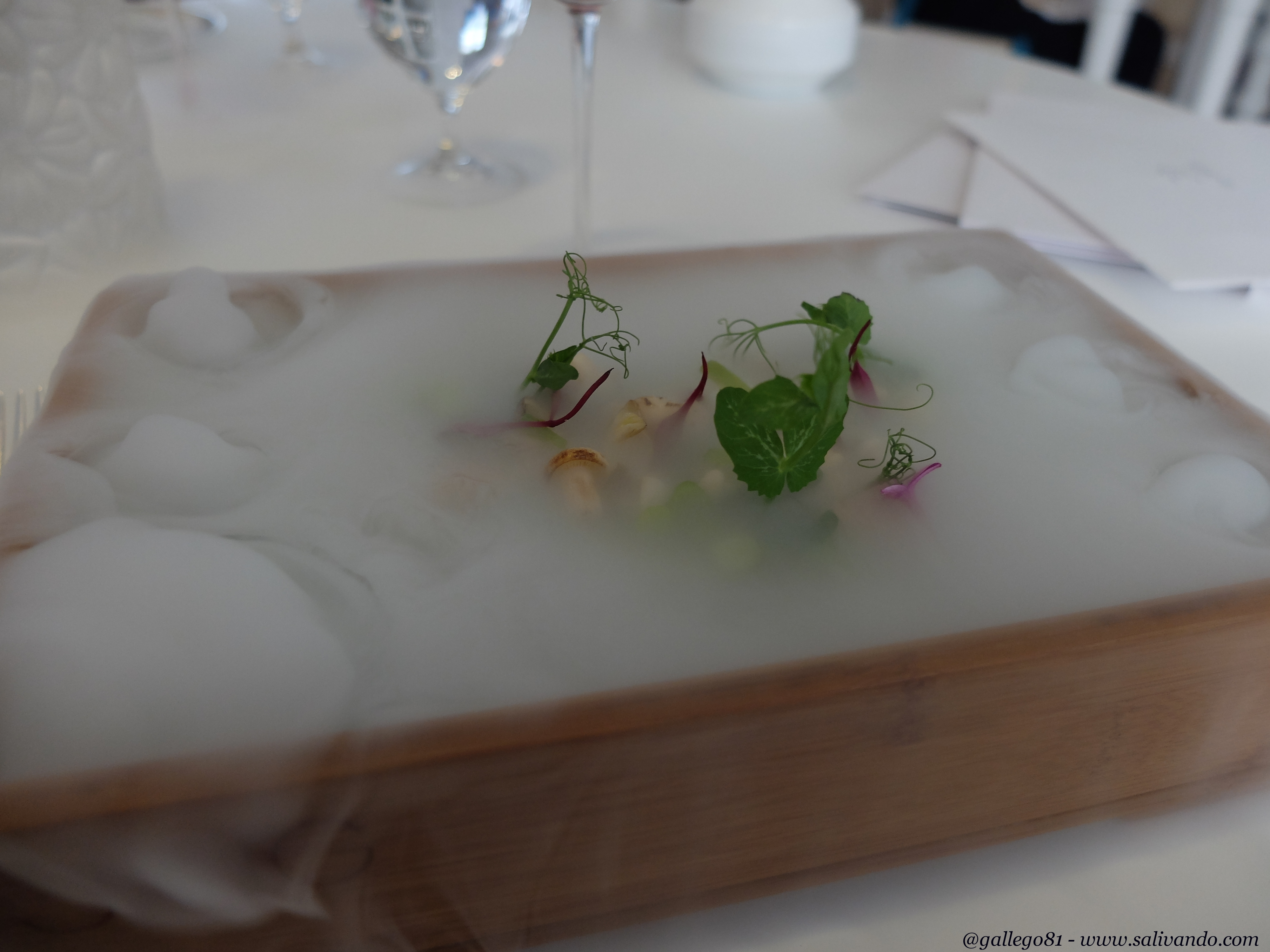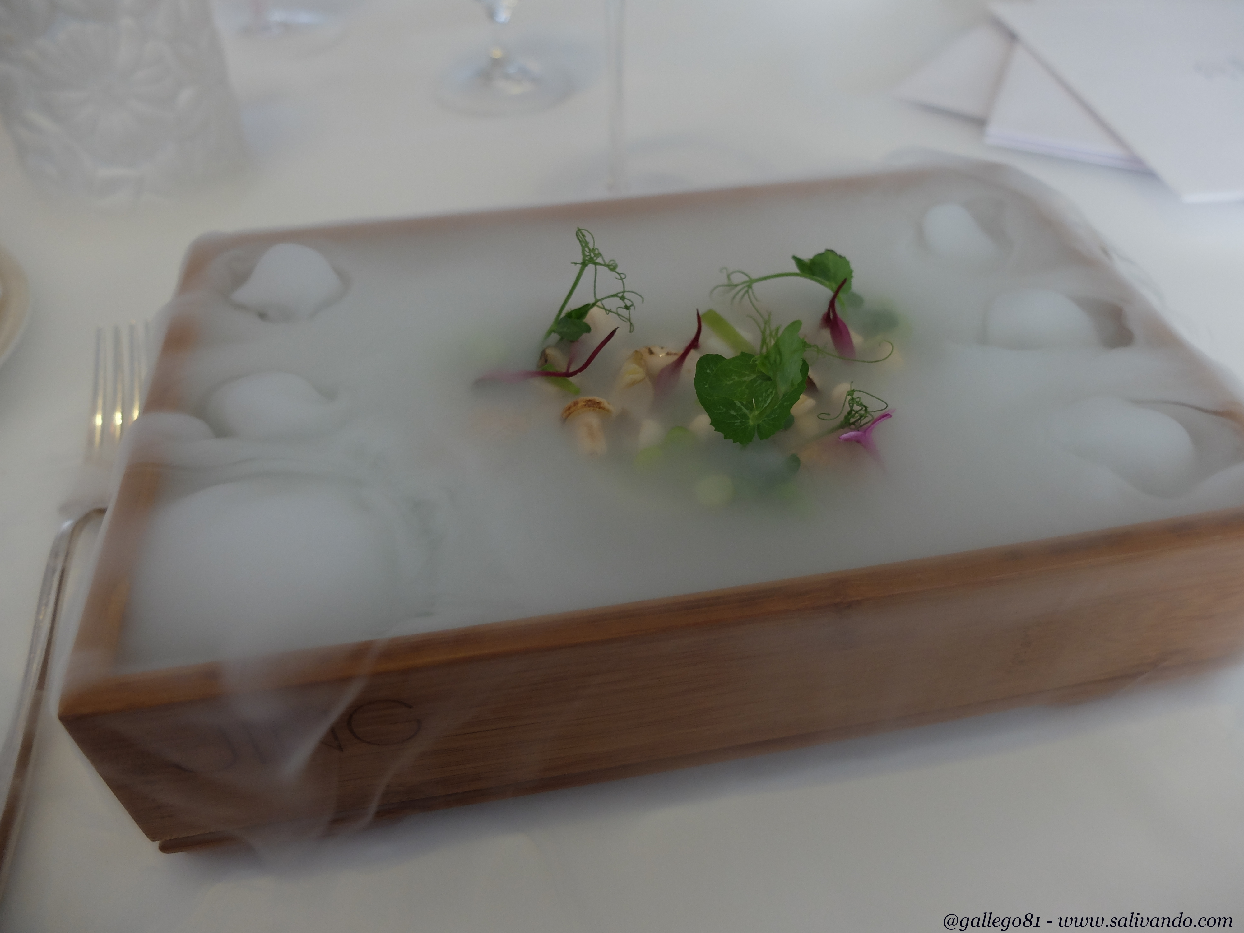 Pero llegados a este punto, sirven el que sin duda es el plato más espectacular del menú: Bruma. Y lo llevan preparando desde 2003. Un plato de verduras preparadas con hidrógeno que crea la bruma que da nombre al plato. Os dejo la secuencia porque lo mejor del plato es cómo vas descubriendo el contenido poco a poco. A parte de que las verduras están en su punto y realmente buenas. Todo un espectáculo.