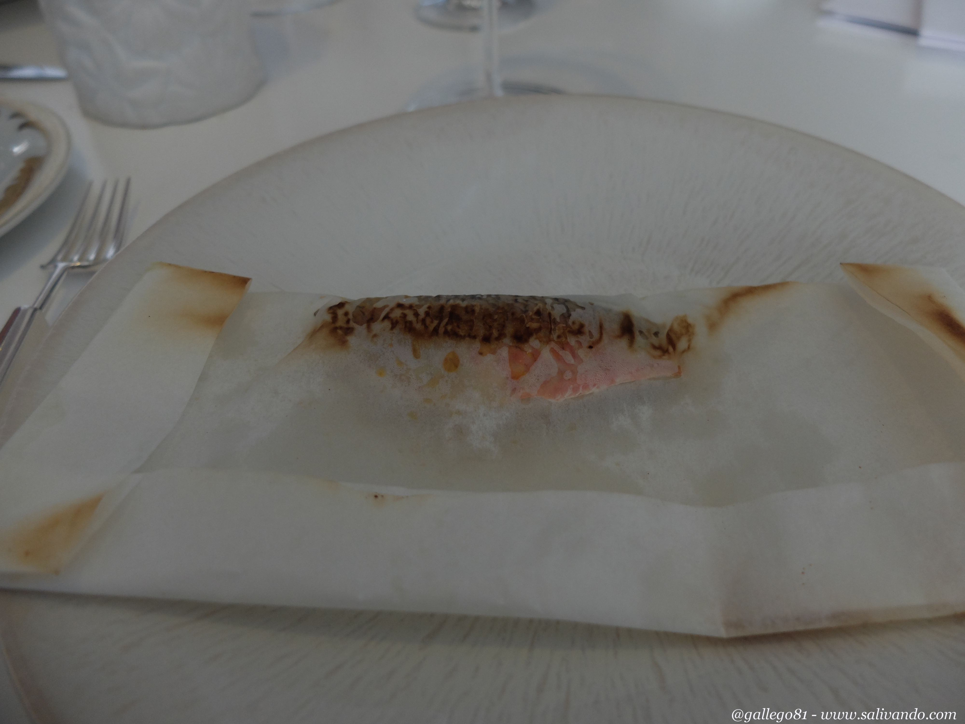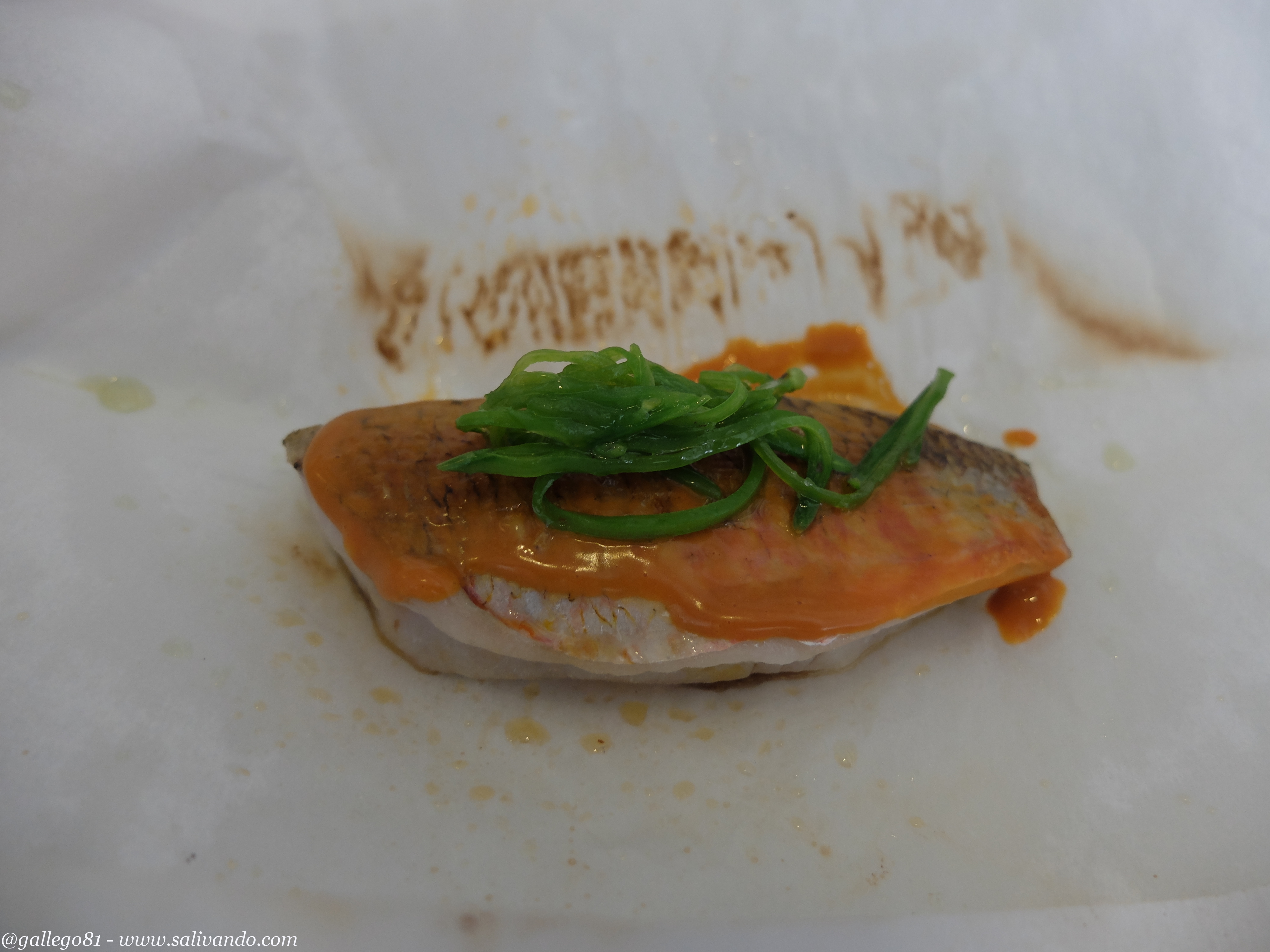 El siguiente platazo fue los Salmonetes con incrustaciones de sus interiores al eucalipto. Lomos de salmonete jugosos a más no poder, sobre una hoja de eucalipto que le da una aroma extraordinario. Presentados en un papel, que los mantiene en su punto perfecto.