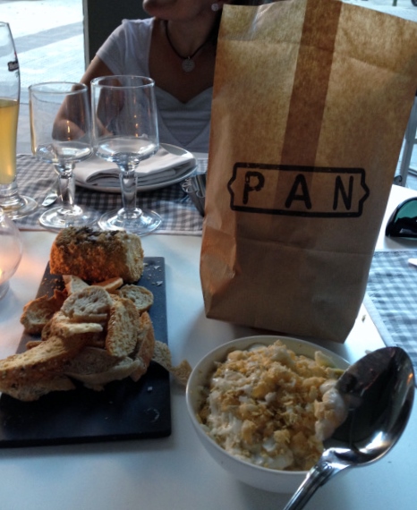 Lo primero que me gustó fue la bolsa del pan, claramente identificada y llena de buen pan. Como primeros entrantes probamos la ensaladilla tartan, que me pareció buenísima aunque ración pequeña; y el foie en polvo de kikos, con pan bizcohado y gelatina de amaretto, que era de buena calidad y abundante, pero el sabor a kikos no nos gustó mucho a ninguno. Una pena.