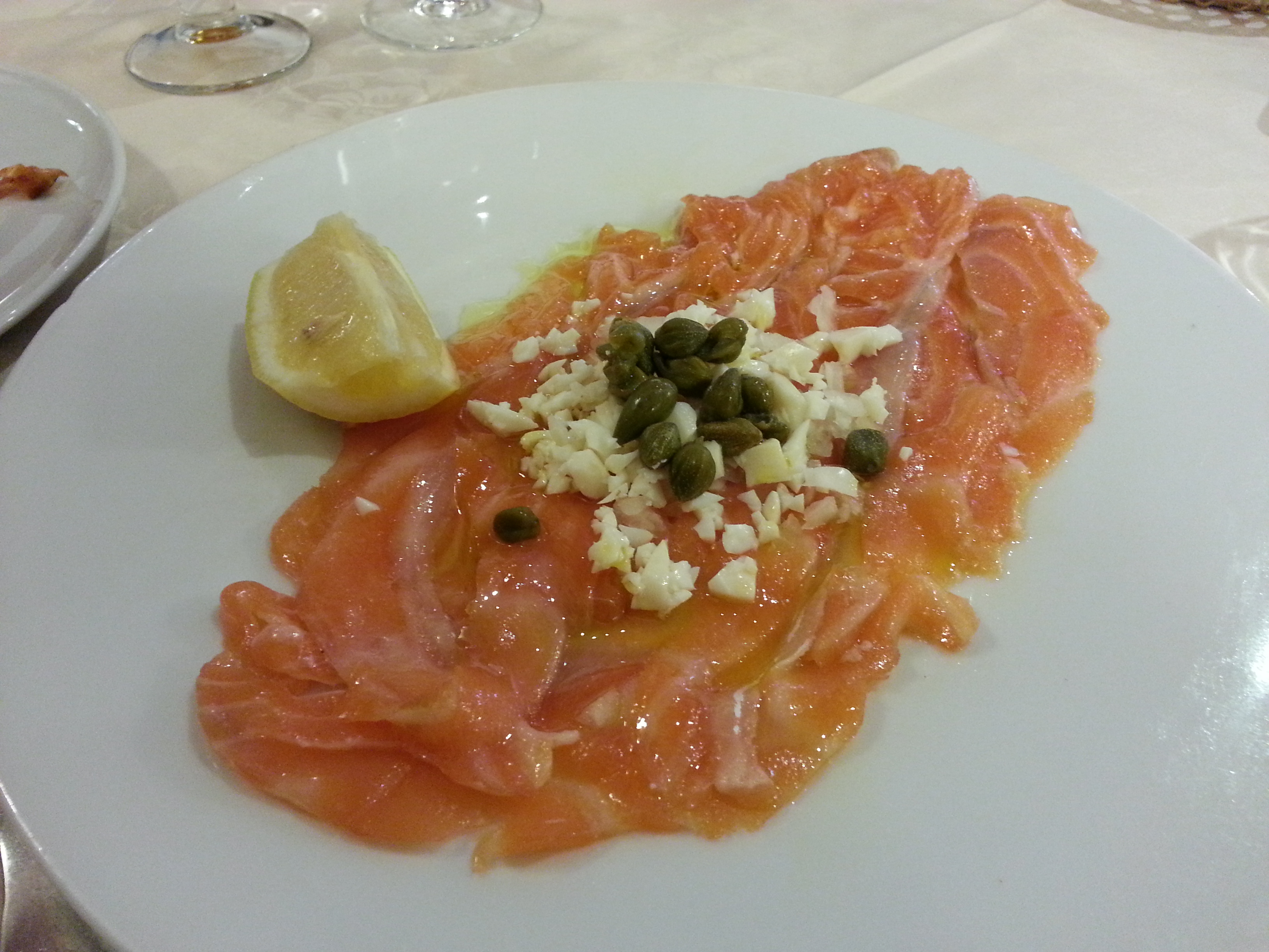 Empezamos con media ración del mejor salmón ahumado que he probado en mucho tiempo. Elaboración casera. Meloso, sabroso y acompañado de su huevo duro y sus alcaparras. Una delicia que os recomiendo ir a probar ya sea sentados o en la barra.