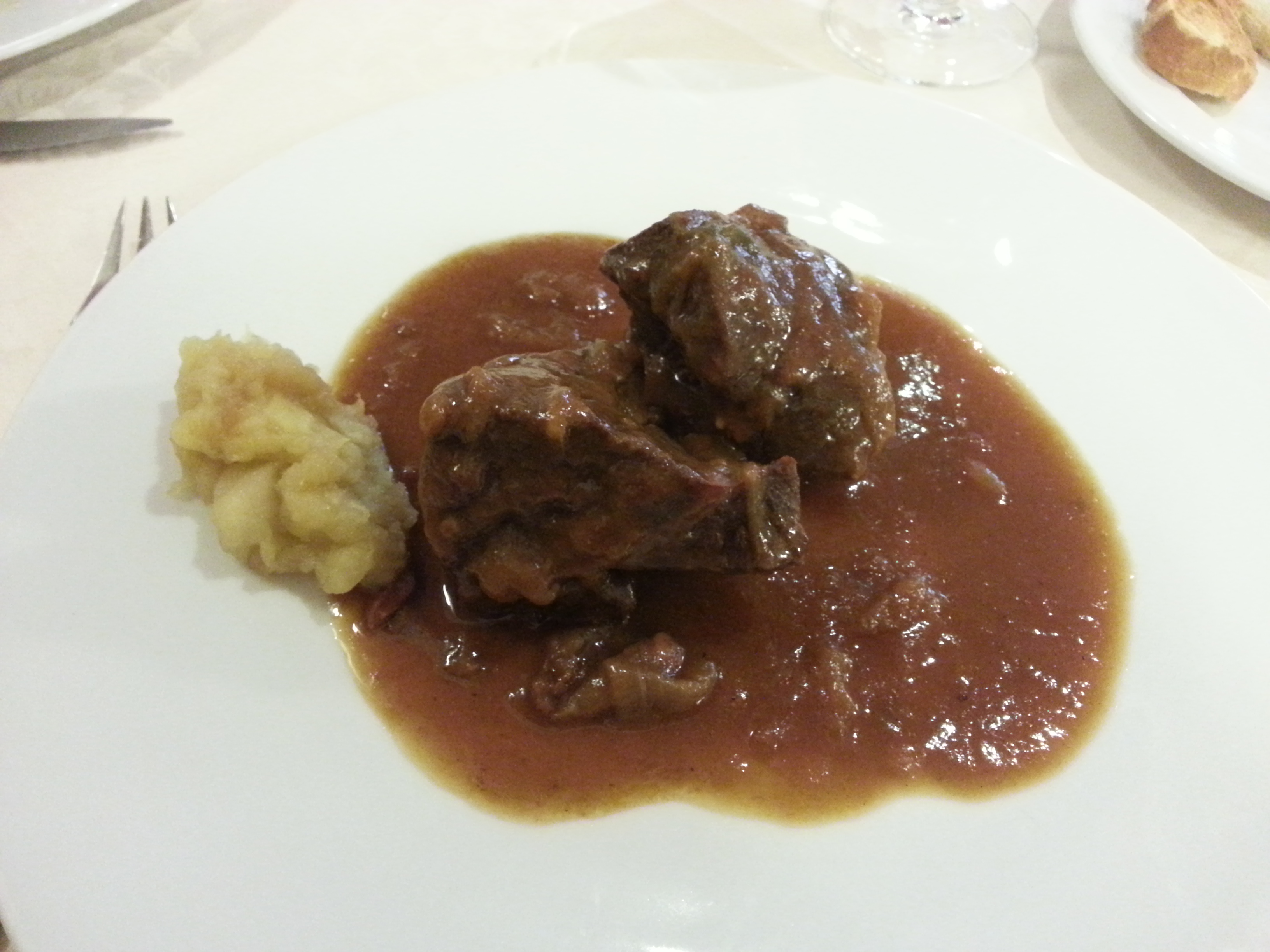 Y de principales nos fuimos a dos platos estupendos y muy de la cocina tradicional española: La perdiz en escabeche y la carrillera de ternera. El escabeche estaba realmente suave y la perdiz jugosa y con buena carne. La carrillera tierna como mantequilla. Acompañada de manzana asada y regada con la salsa de su guiso. Altamente recomendable.