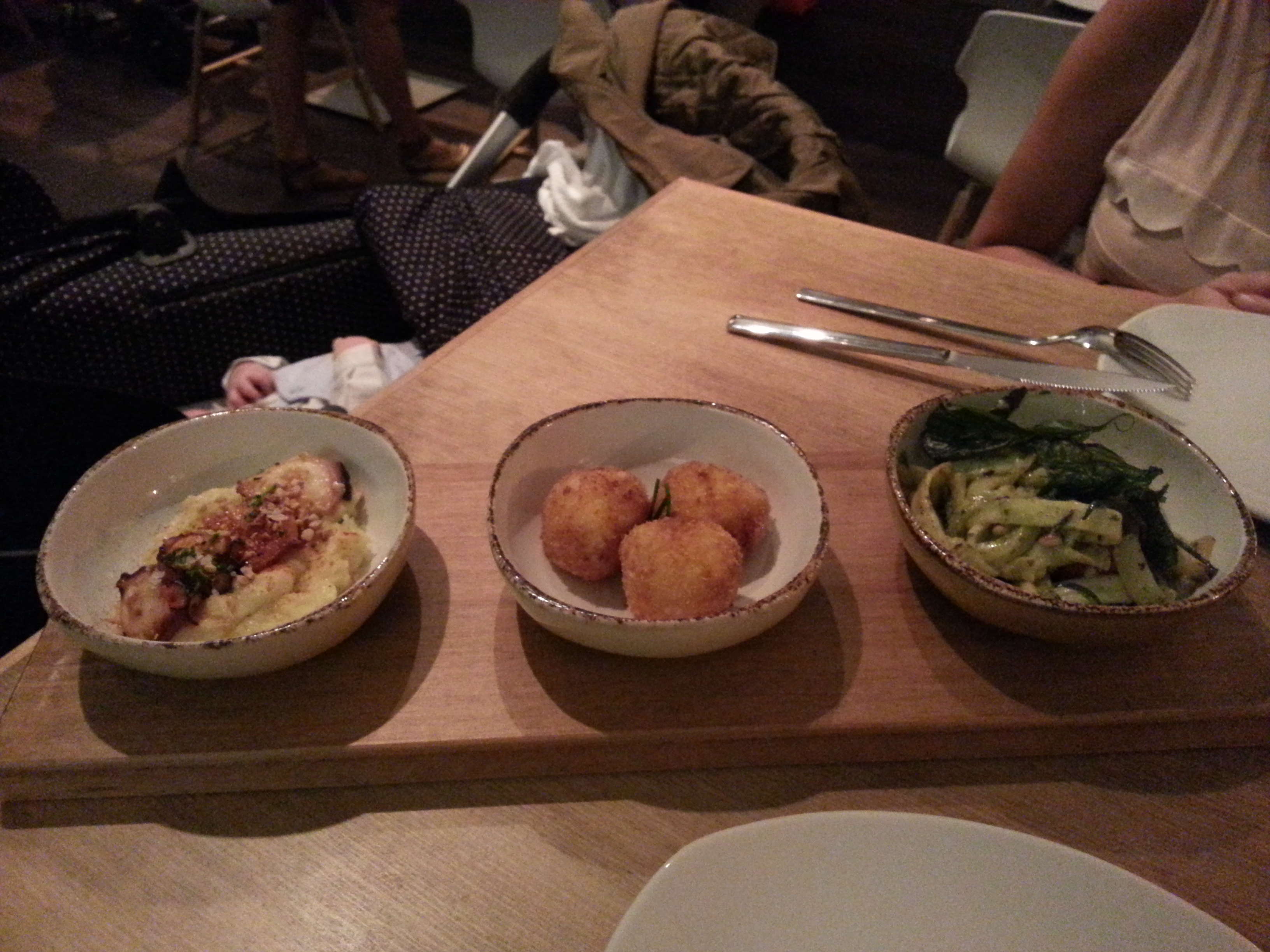 Empezamos con un ejemplo de tres tapas. El primero es el pulpo braseado sobre puré de patatas. Realmente bueno. Sabroso y con unos toppings de almendras que quedan genial. Los tallarines de calabacines son otra de las tapas que os recomendamos. Son tiras de calabacín muy bien preparadas y presentadas. Con pesto y piñones en abundancia. Y en el centro, las croquetas. Las puedes pedir de jamón o de boletus. Nosotros pedimos de jamón y la verdad es que están buenas pero si visitáis el restaurante Slow consideramos que hay otros platos que deberías probar antes que las croquetas.