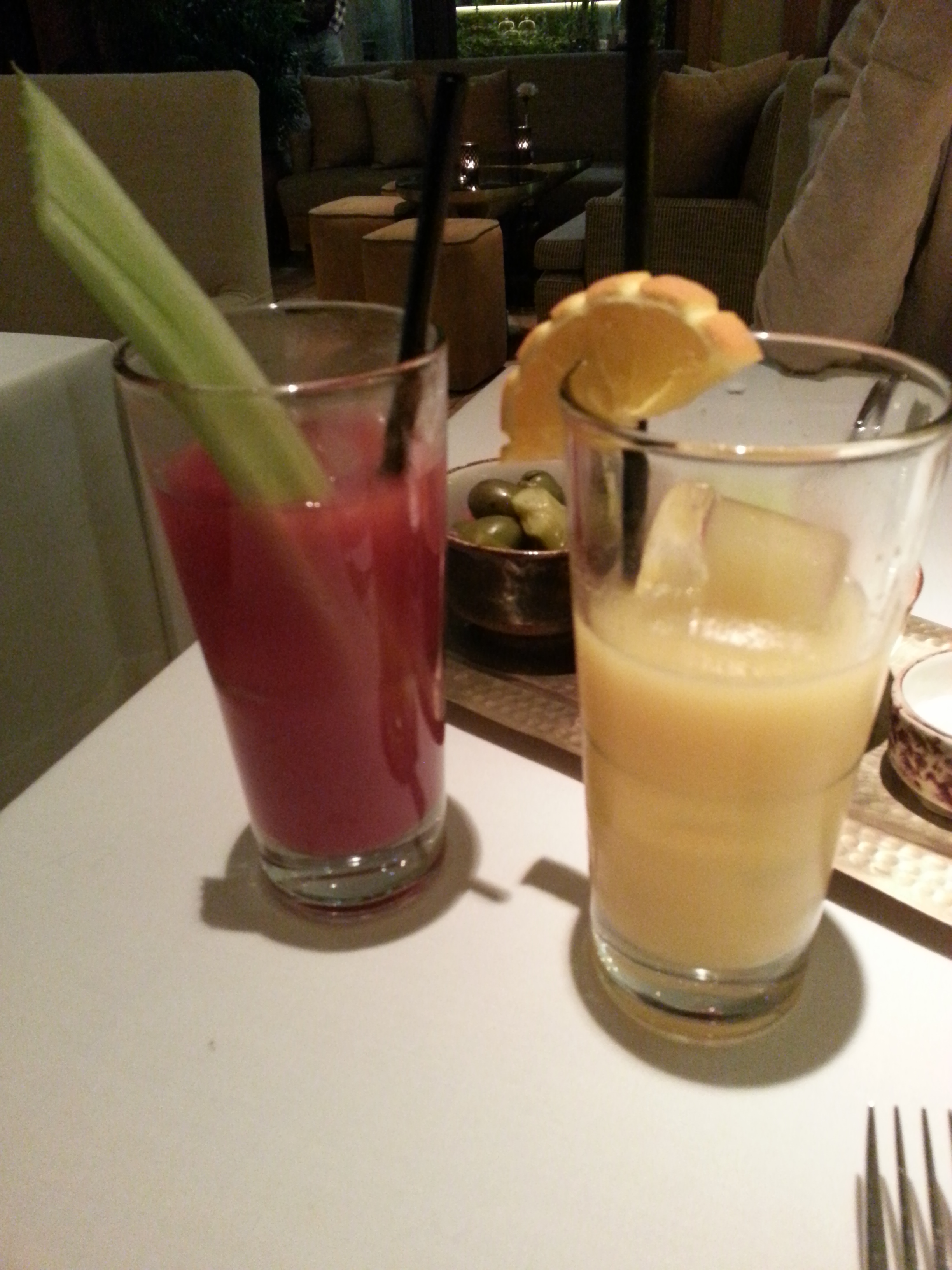 Empezamos a contaros para que veáis la buena pinta que tiene. Primero con una foto de la barra y el bloody mary y el rattlesnake (naranja, limón, orgeat, miel y especias) con los que empezamos la cena.