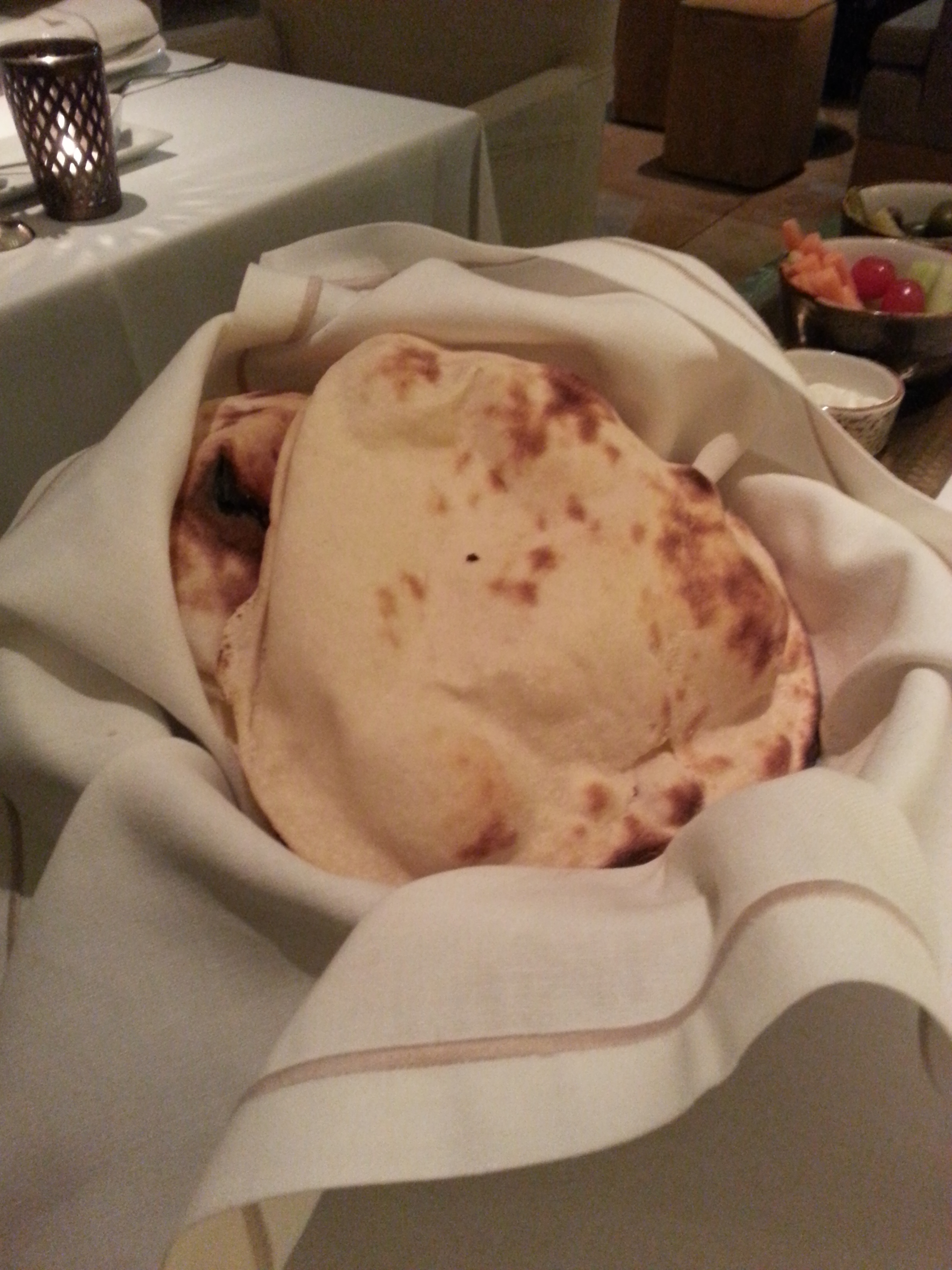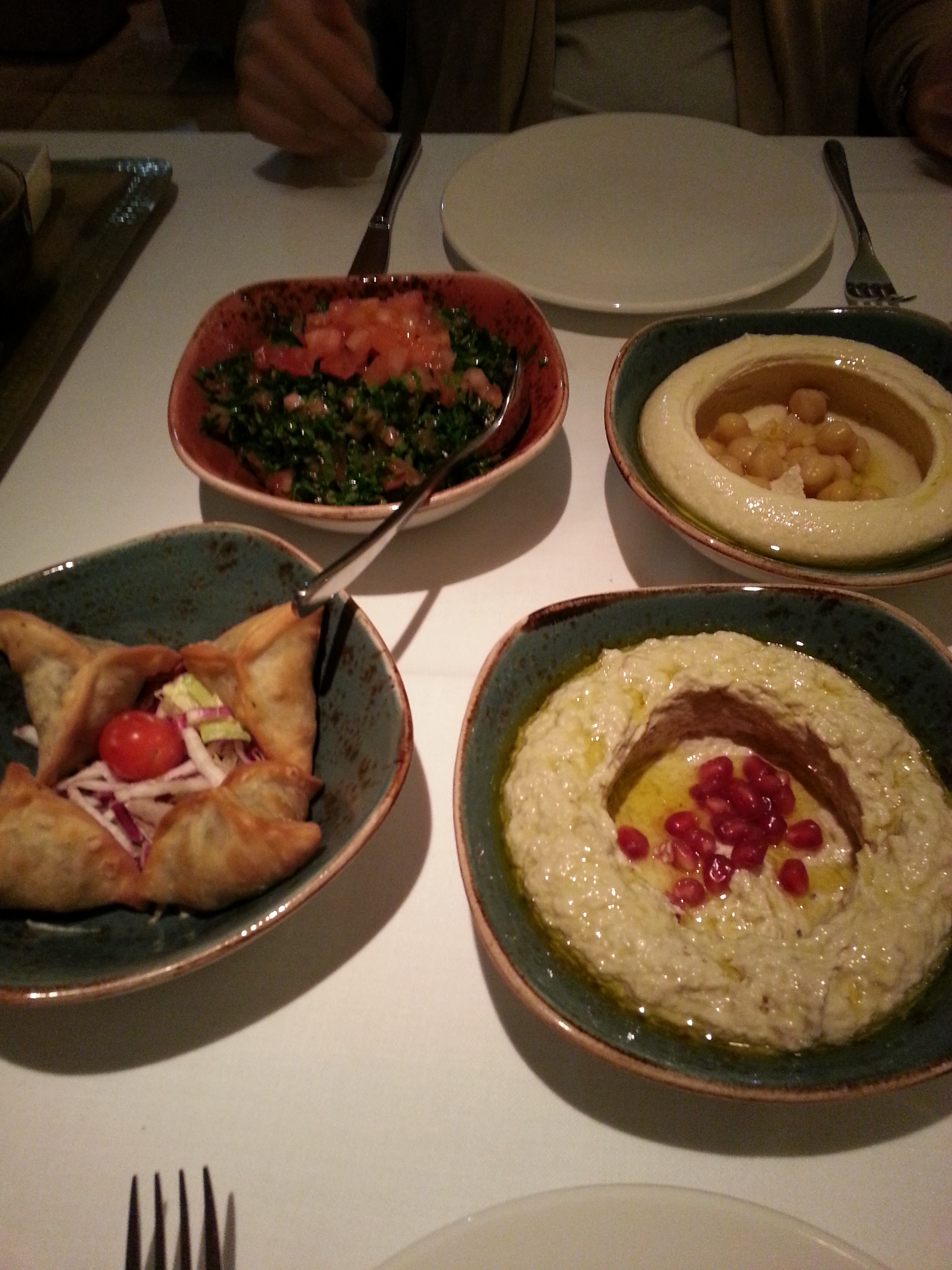 La verdad es que los entrantes estaban realmente buenos. El que más nos gustó fue el mouttabal. Sabor a berenjena, parrilla y el toque fresco de la granada. El hommous también estupendo y la próxima vez lo pediremos acompañados de cordero.