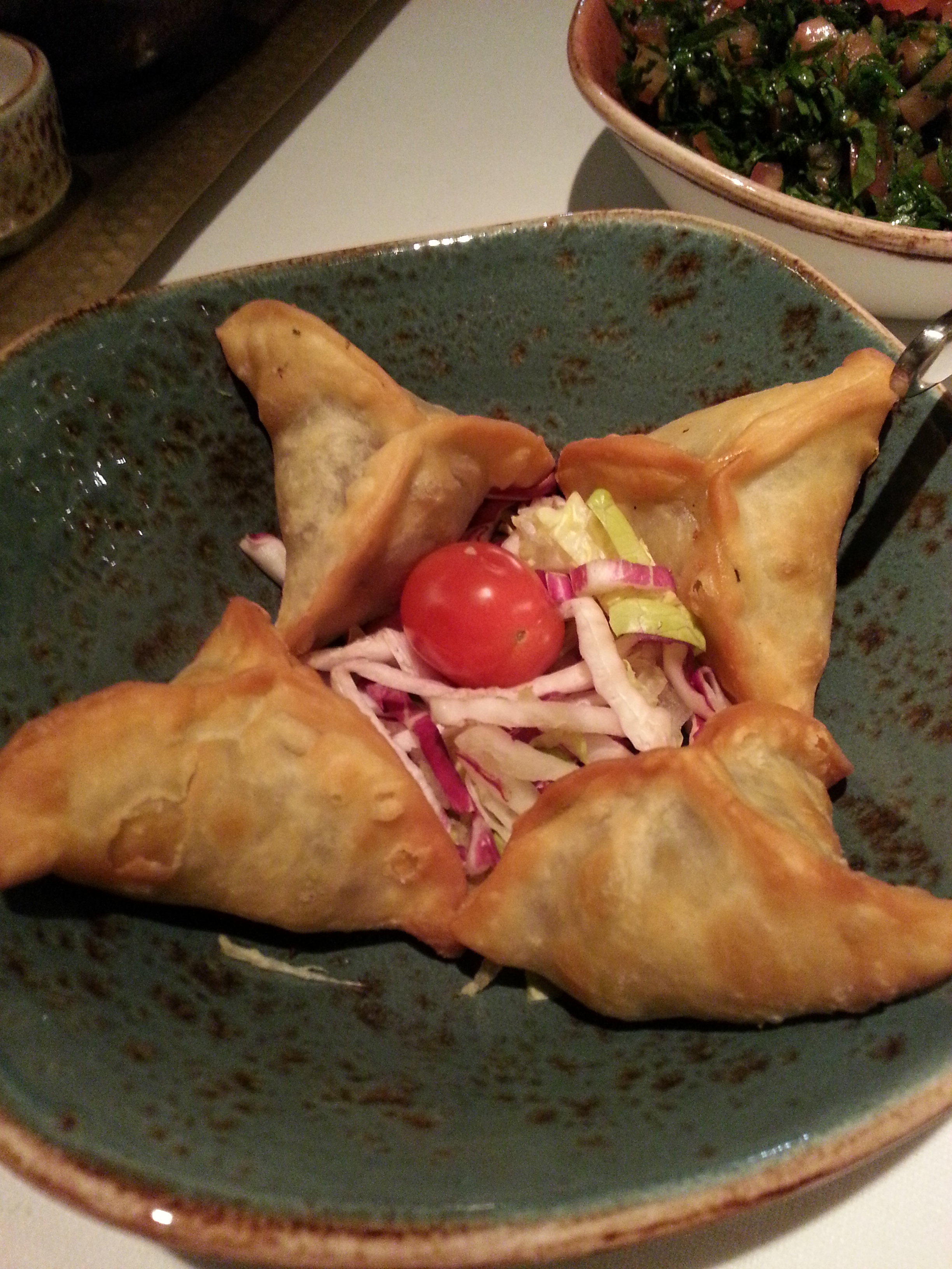 Y aquí os presentamos los entrantes calientes del menú de degustación. El que más nos gustó fue el falafel. Muy bueno. Eso sí, llena de verdad. Con uno de estos cubres las necesidades nutriticionales diarias seguro. Y el que más nos sorprendió fue en Sfiha.