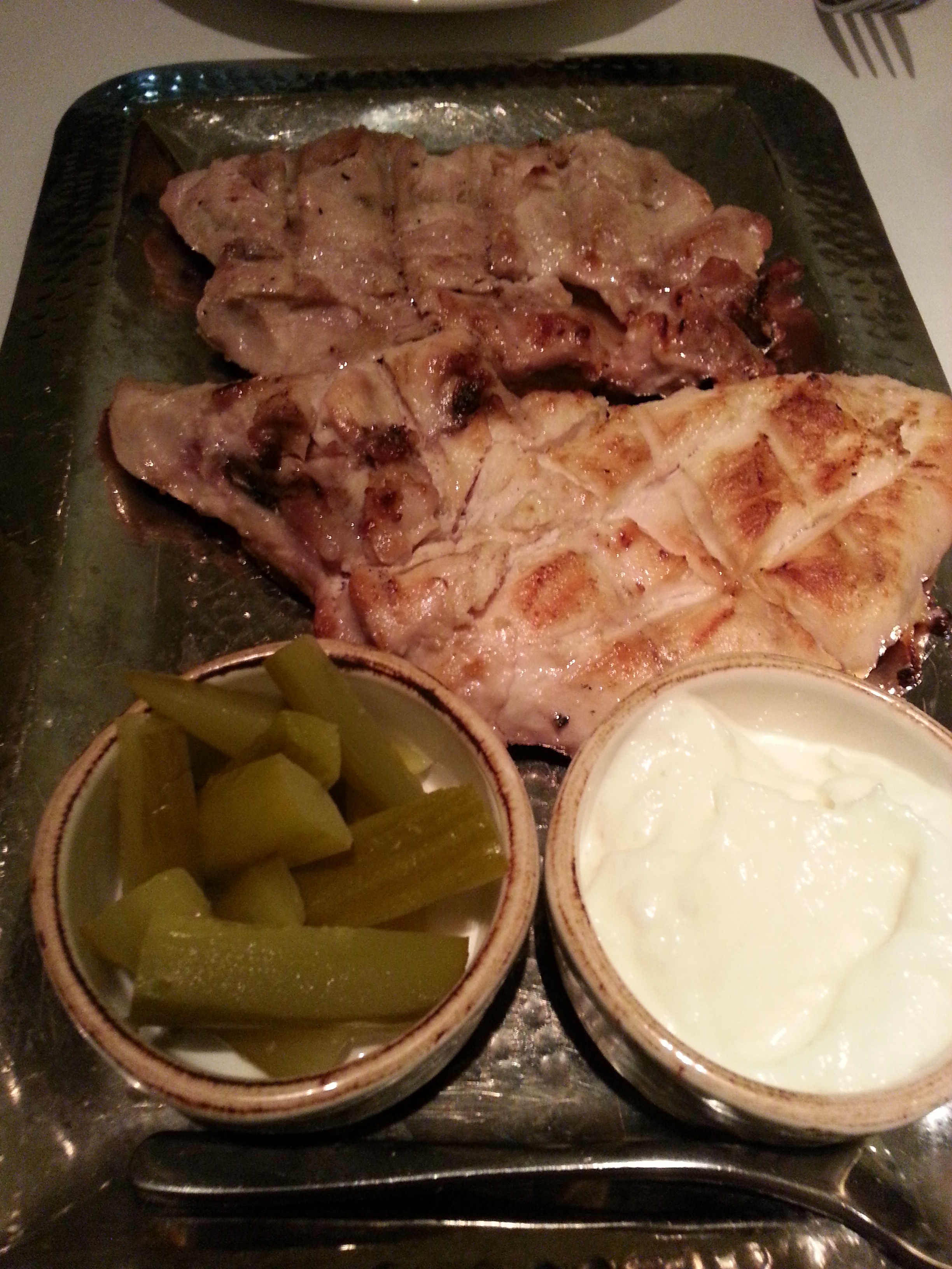 Como plato principal pedimos el shawarma djaj, pechuga de pollo marinada y acompañada de crema de ajo. Realmente bueno. El pollo lo hacen a la parrilla de carbón y junto con el marinado hacen que esté realmente sabroso.