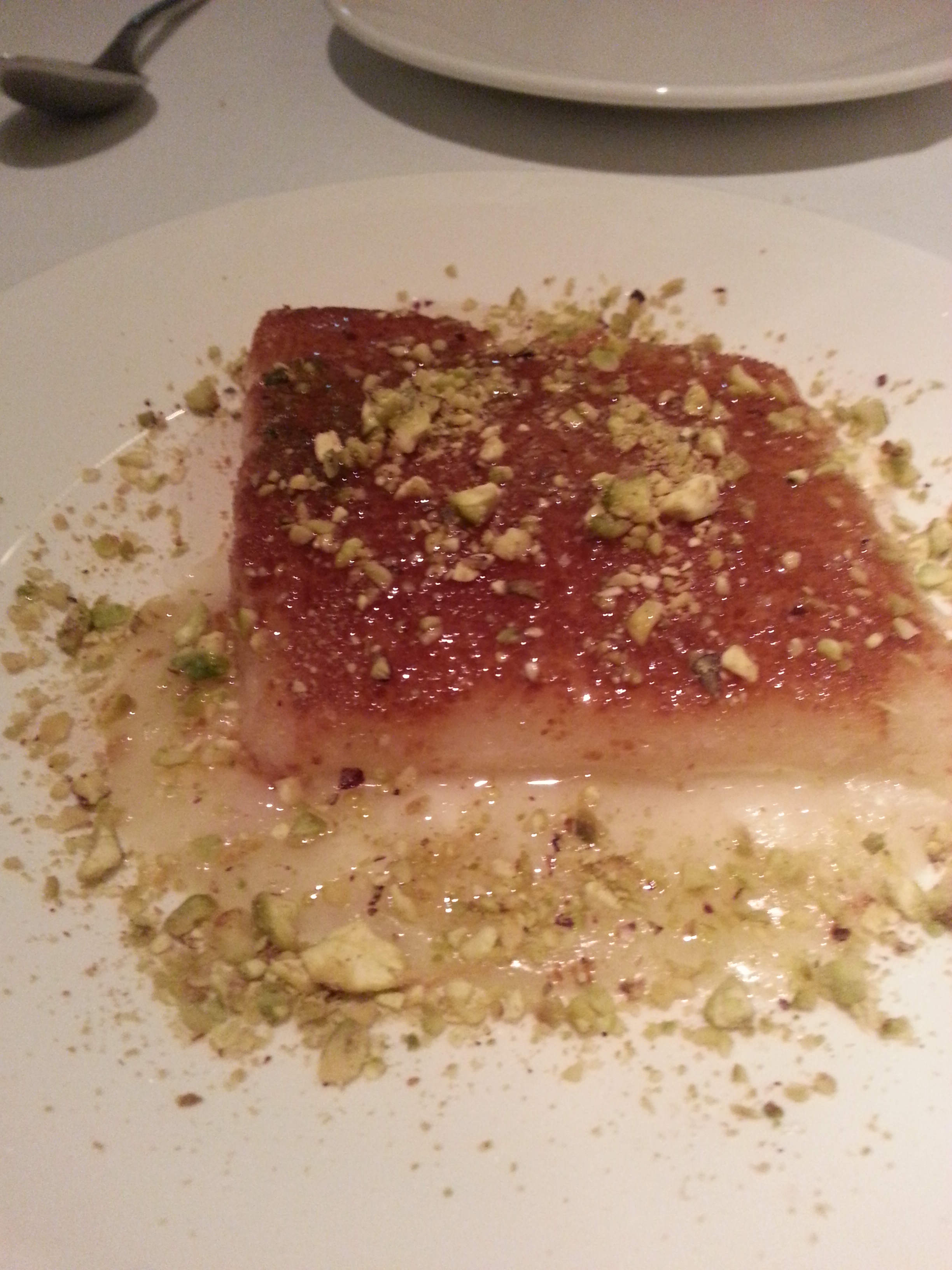 Y por último pedimos el Kenafe que es la tarta de queso caliente con pistachos. A nosotros nos encanta la tarta de queso y esta es diferentes. Está muy buena pero eso sí, va acompañada de sirope. Si te gusta el dulce no dudes en pedirla.
