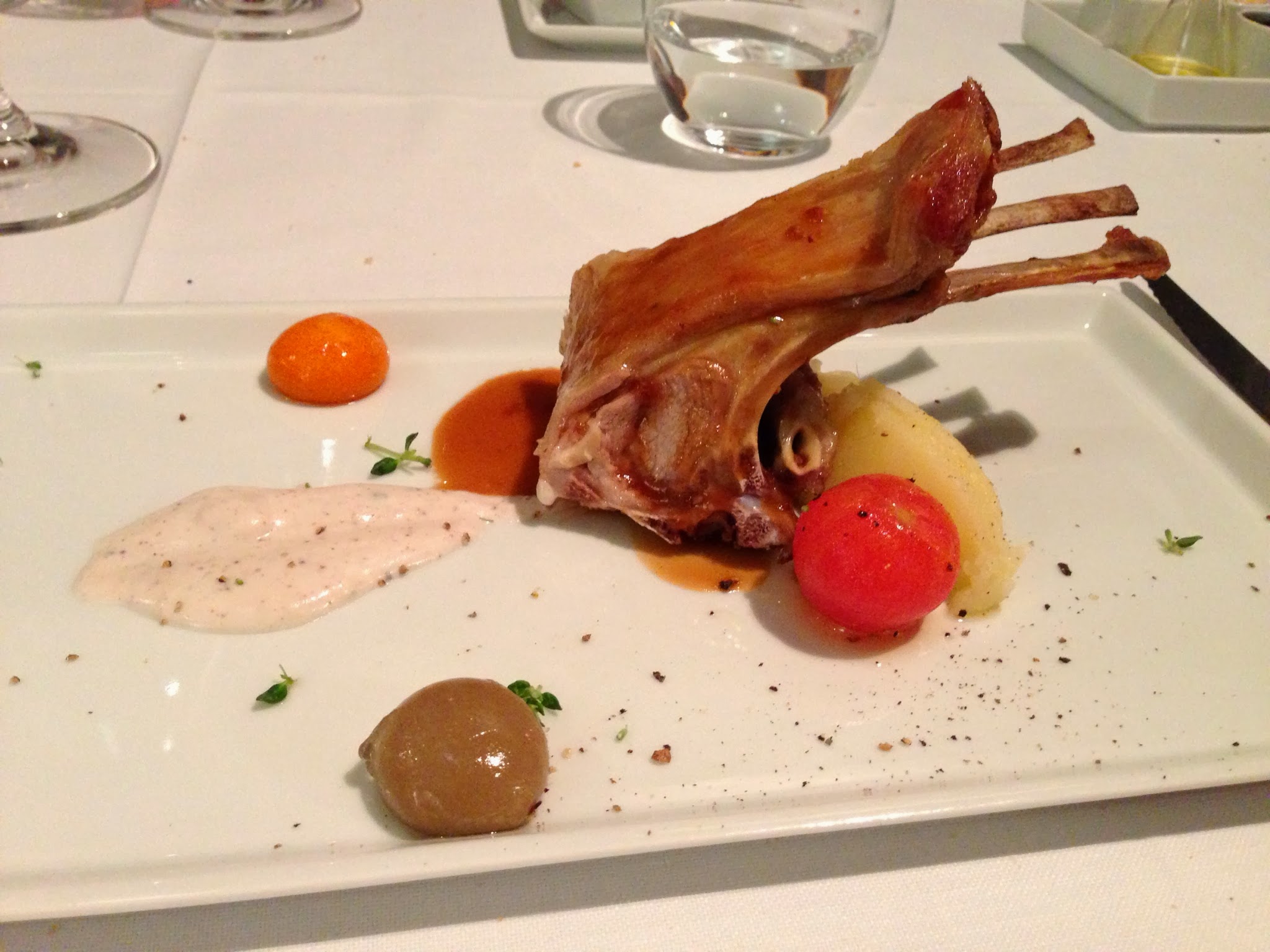 El plato final fueron las costillas de cordero con crema de yogur, escalibada y puré de patatas. Otra delicia sorprendente. Una de las mejores cosas de este sitio es que el plato está lleno de sorpresitas como las «gotas» de zanahoria o pimiento que lo acompañaban.