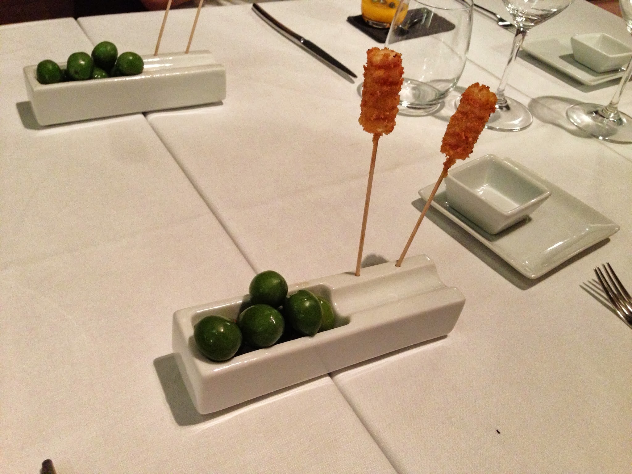 Empezamos la comida con unas cervecitas y un aperitivo sencillo, pero triunfador. Unas aceitunas de Sicilia con un sabor espectacular, y unos miniflamenquines con confitura de tomate.