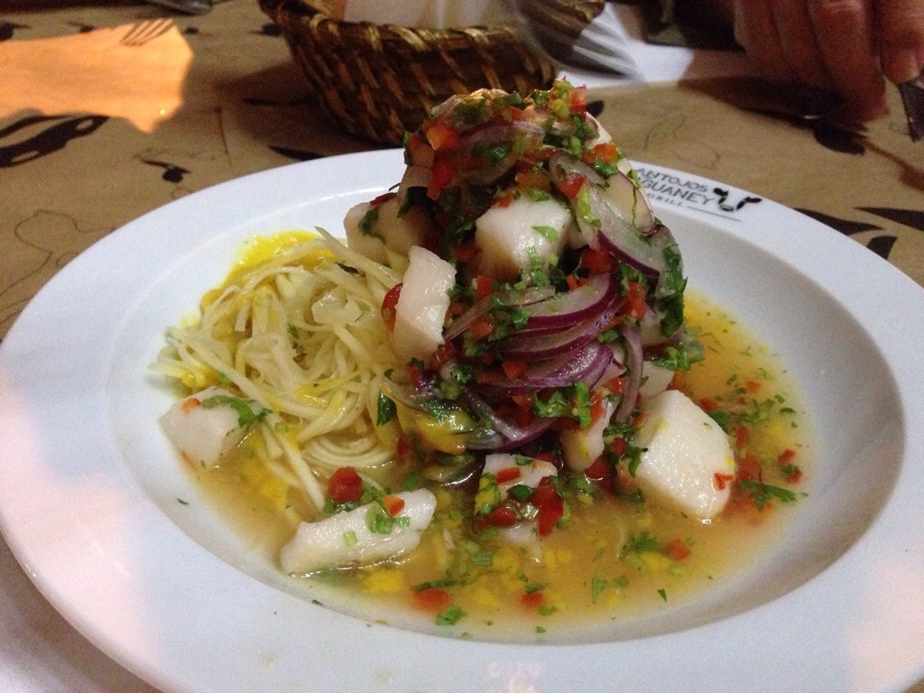 De aperitivo comenzamos con ceviche Cuyagua, que fue probablemente lo mejor de la cena. Normalmente lo ponen de halibut, pero ese día no sé por qué lo trajeron de mero, recién recién hecho, según nos dijo el cocinero. La verdad es que estaba espectacular en todos los sentidos. Lo sirven en una copa grande y luego lo vuelcan en un plato. Va marinado en lima y con mango verde.