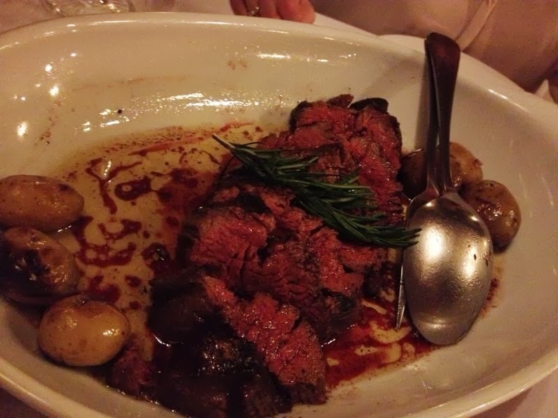 De carnes hay cerdo negro, entrecot con salsa de setas y alguna cosa más, pero lo más rico y más impresionante con diferencia es el solomillo de ternera arauquesa. El solomillazo, vaya. Es un solomillo del que pueden comer 2 o 3 personas, en su punto perfecto, rosita por dentro y tostado por fuera, asado y presentado en una bandeja caliente con aceite y patatas. Creedme que probaréis pocas carnes tan deliciosas y tiernas como esta. Merece toda la pena. Para los que os guste un poco más hecha lo podéis pedir así, o si tumbáis la carne un rato contra la bandeja, se hará un poquito más, ajustándolo como queráis.