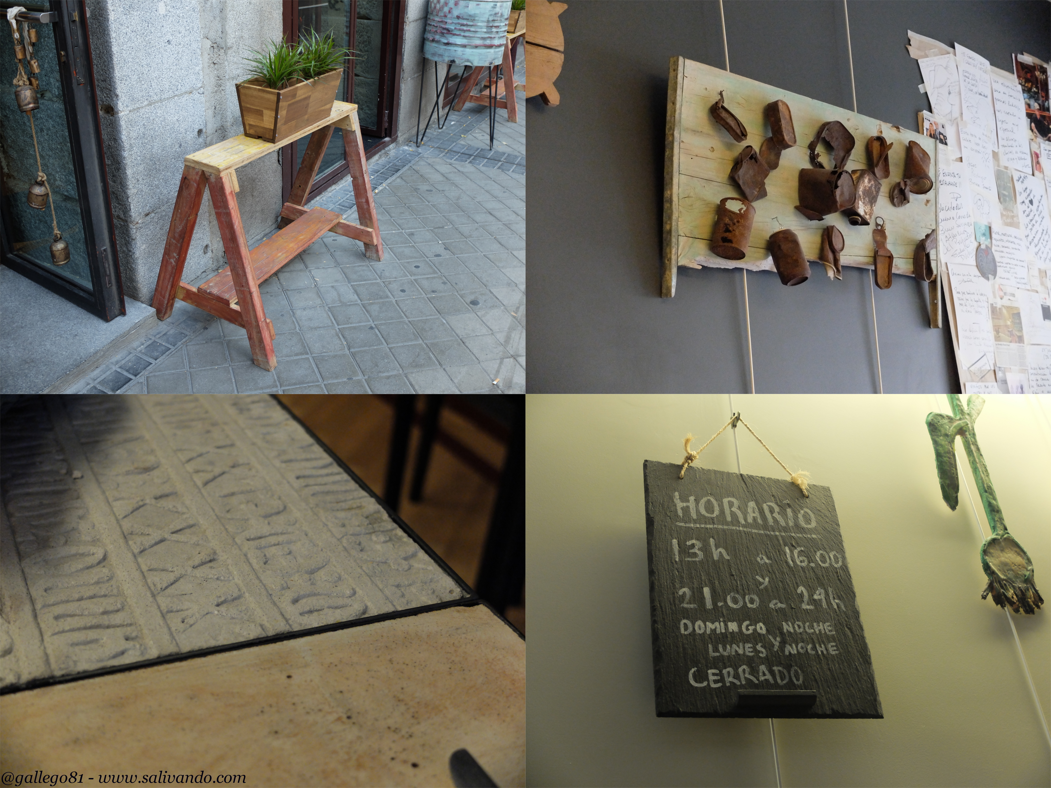 Fuimos un mediodía de fin de semana y el ambiente es tranquilo. Seguro que por la noche la cosa está más animada. El local es pequeño. Es el antiguo local de Antojo. Pero eso le da intimidad y encanto. Y la decoración del restaurante está realmente bien. Artículos rústicos reciclados, vajilla ambar de Duralex, las borriquetas de la entrada… todo con mucho gusto.