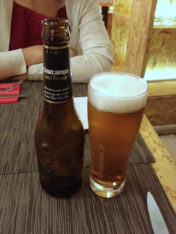 Empezamos con una cervecita fría Cruzcampo Gran Reserva, que es del estilo de la Alhambra 1925 y muy buena opción. Luego con la cena optamos por un clarete navarro de uva Gewurztraminer, que estaba muy bueno. De aperitivo probamos el pan tumaca, que en principio no tiene mucha ciencia, pero este estaba muy cuidado, con su buen pan de coca bien tostado y su buen aceite, su ajito…