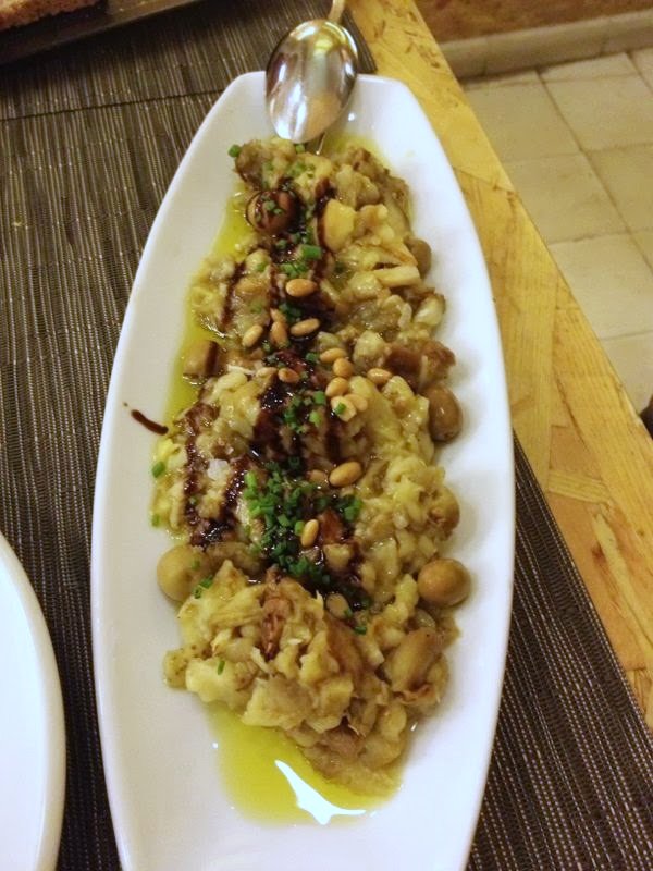 Luego ya de «segundo» pedimos otro plato de los estrella: la berenjena a la llama, con piñones tostados y balsámico. Nuestras sensaciones con este plato fueron encontradas. Por un lado la berenjena y los piñones estaban tremendos, con el toque dulce del balsámico, y el ahumado le sentaba bien, pero por otro lado el sabor ahumado al final resultaba demasiado dominante porque era MUY intenso y acababa cansando. De todas formas sí que nos pareció bueno en general.