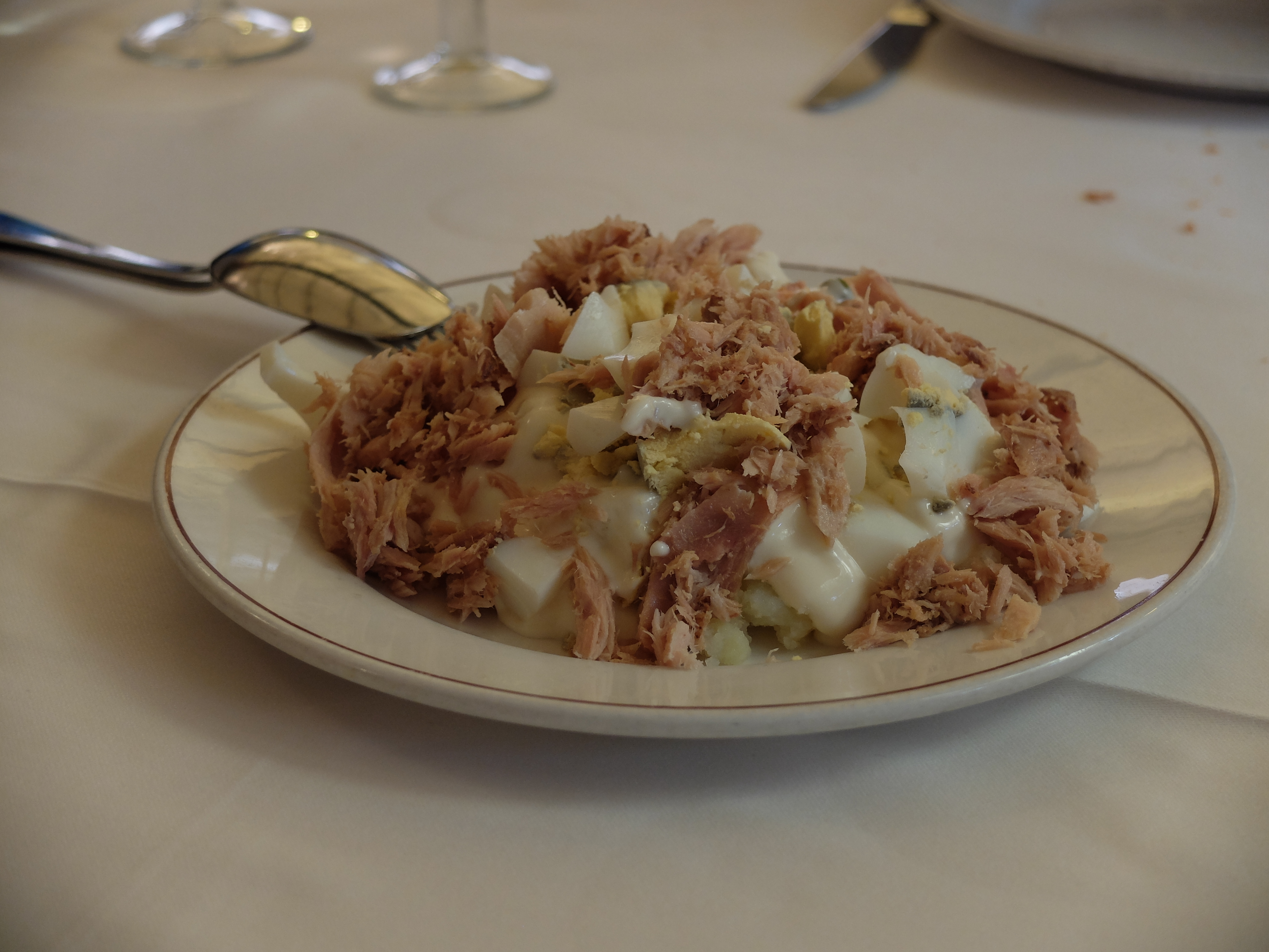 Nos dimos un señor homenaje del que os voy a contar poco y enseñar mucho. Empezamos con un plato obligatorio de ensaladilla, que ventilamos rapidamente y Antón no dudo en pedir otro. La ensaladilla está buenísima pero es diferente a la que suelen servir en los bares. Y es que los ingredientes no están muy ligados. La patata cocida, la mayonesa y el atún van cada uno por su lado. Independientemente de esto, la ensaladilla está buenísima.