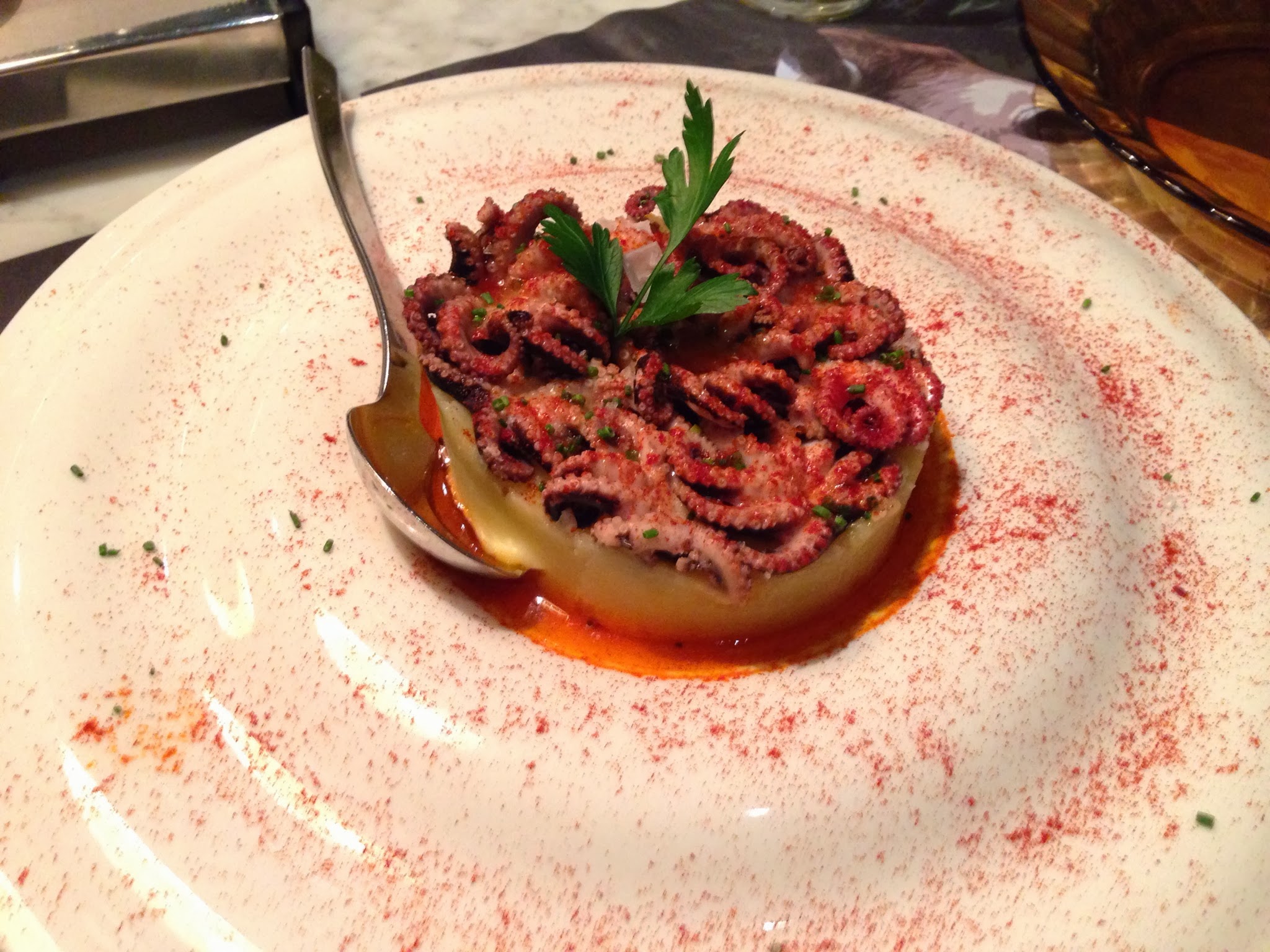 Empezamos el ejercicio con unos pulpitos con pimentón y aceite sobre un puré de patatas. Tan sencillo como delicioso, y ración generosa.