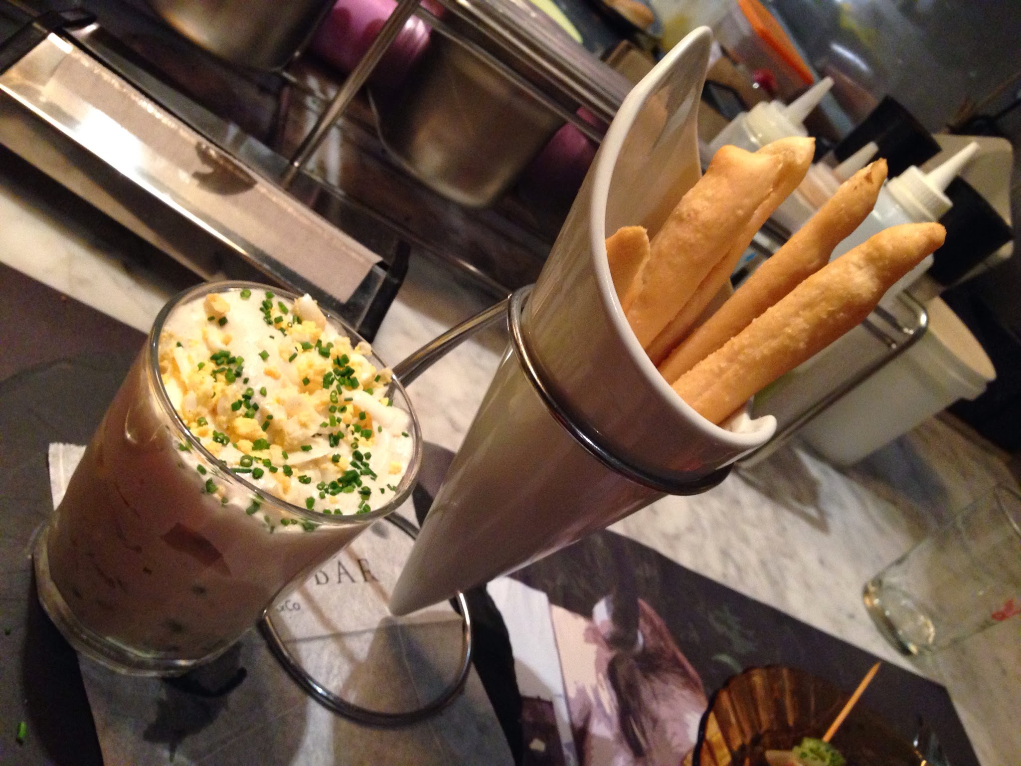 En Mercatbar hay también un comedor amplio, pero nosotros pensamos que la mejor forma de conocerlo era encontrar un hueco en la barra e improvisar. Fuimos un sábado, por lo que al llegar nos costó un poco encontrar un hueco y que nos hicieran caso, pero la verdad es que luego todo fue como la seda. Tanto el cocinero que teníamos delante en la barra como los camareros eran unos profesionales como la copa de un pino. Lo único que me incomodó un poco era que no te dejaban quedarte la carta para seguir mirando por si querías pedir más. Pero bueno, al final hicimos un pedido y luego pedimos la carta de nuevo para hacer otro. Nada más llegar, mientras mirábamos la carta nos pedimos una cervecita: una Cruzcampo helada y muuuy bien tirada. De compañía una bolsa de patatas fritas caseras con un toquecillo de pimienta que tardó segundo en caer.