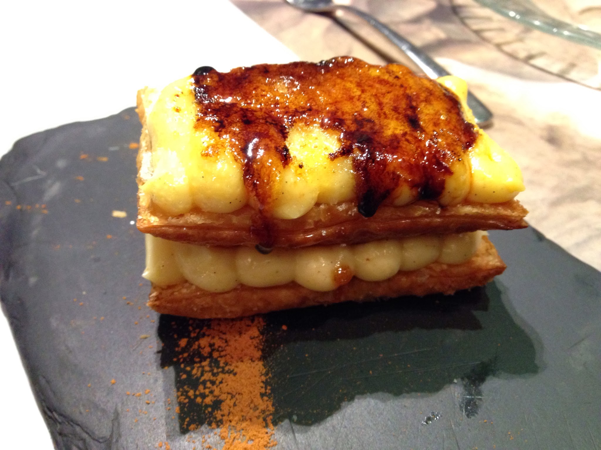 De cantidad la verdad es que pedimos muy bien, acabamos casi llenos, lo perfecto para tomar un postrecito, que nos apetecía. Probamos tanto el milhojas noisette como el souflé de chocolate. El milhojas no tenía tantas como mil, pero era crujiente preparado al momento, con su cremita caramelizada y avellana… Enorme!