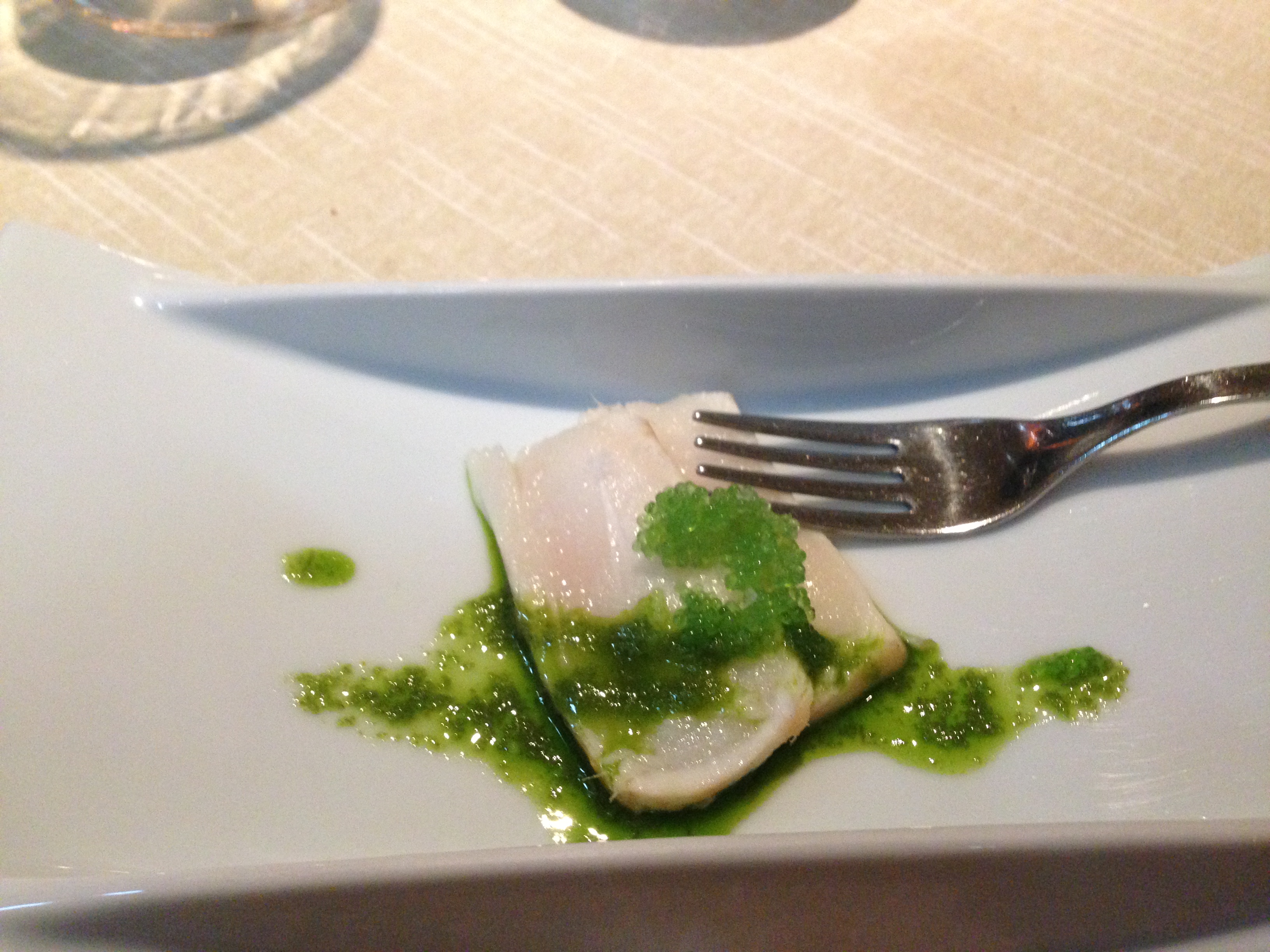 Como aperitivo de la casa, nos pusieron pez mantequilla con caviar de wasabi. Muy rico el aperitivo y sorprendente el toque explosivo y adictivo del wasabi, que acompaña perfectamente al pescado.