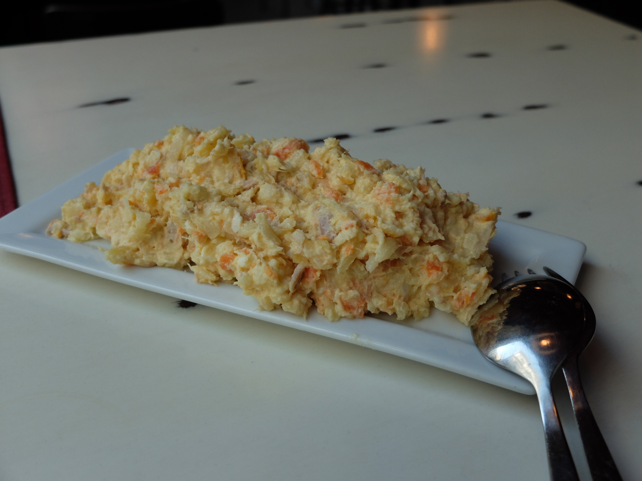 La carta es muy extensa y, como podéis ver en este enlace, de la gran mayoría de platos puedes pedir medias raciones. Son todo facilidades para un buen tapeo. Nosotros empezamos con media ración de ensaladilla rusa y otra media de croquetas. La ensaladilla rusa, con abundante zanahoria y con la cantidad de mayonesa justa, estaba realmente buena. Nos la comimos sin darnos cuenta, y eso que era una media ración muy abundante. Pero es que con una cervecita y tus buenos picos de pan, entraba sola.