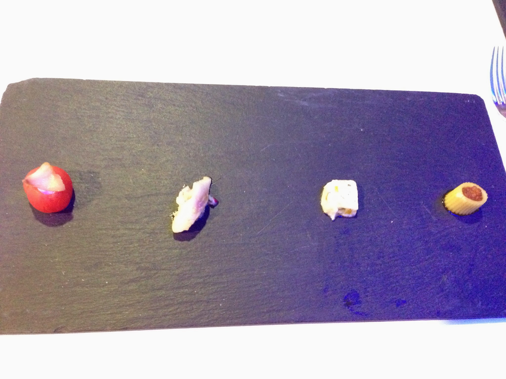 Empezamos el menú con una bandeja de entrantes un poco dispar. La verdad es que dos de ellos estaban muy buenos, pero los otros dos eran sencillamente correctos. Respectivamente eran de caballa, arenque, pez roca y bonito. En general los toques de pescado están presentes en todo el menú.