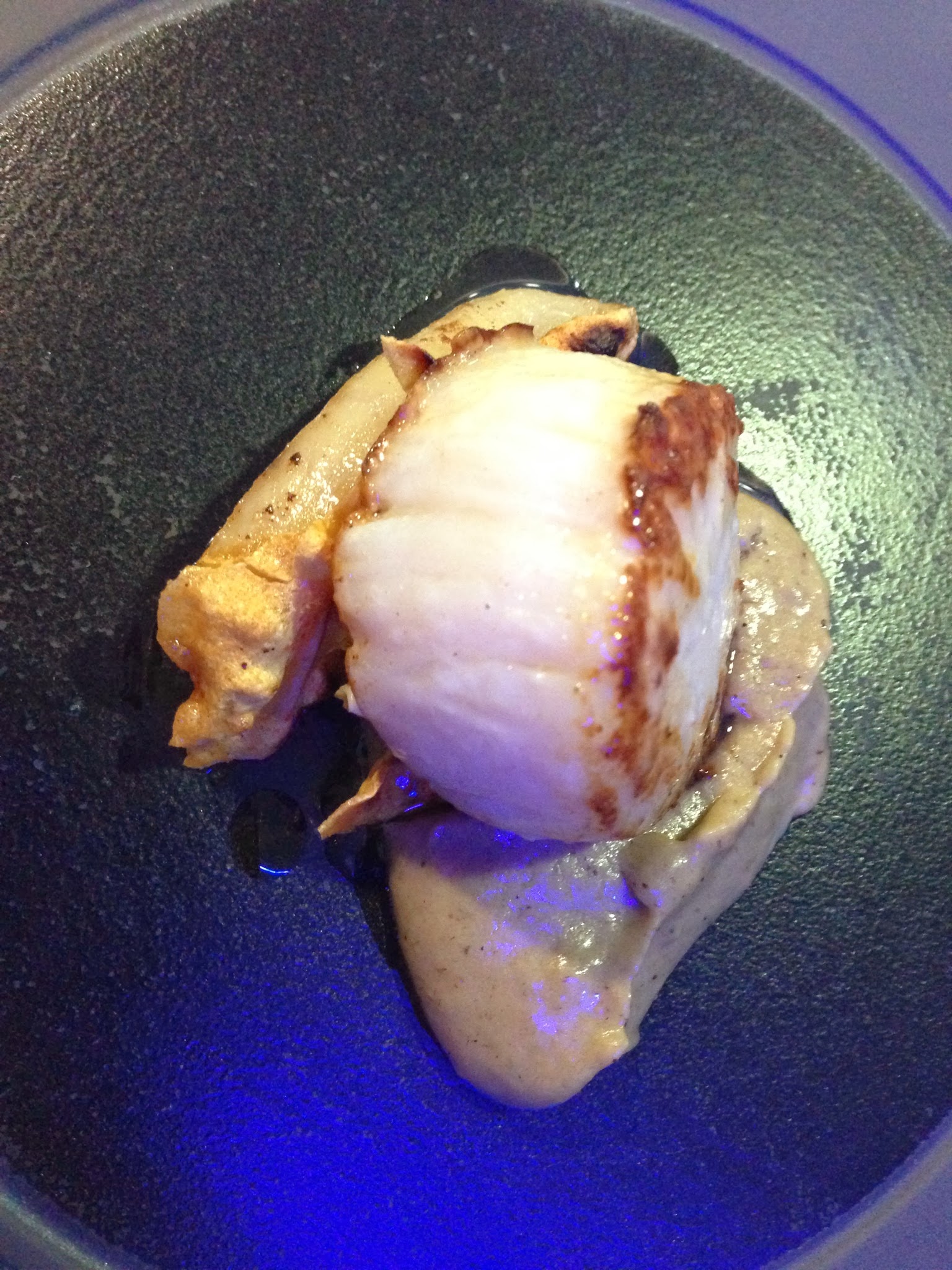 Después llegó lo que más nos gustó del menú, una vieira enorme con crujiente de papada y royal de alcachofa. La vieira era brutal, y todo un acierto la combinación.