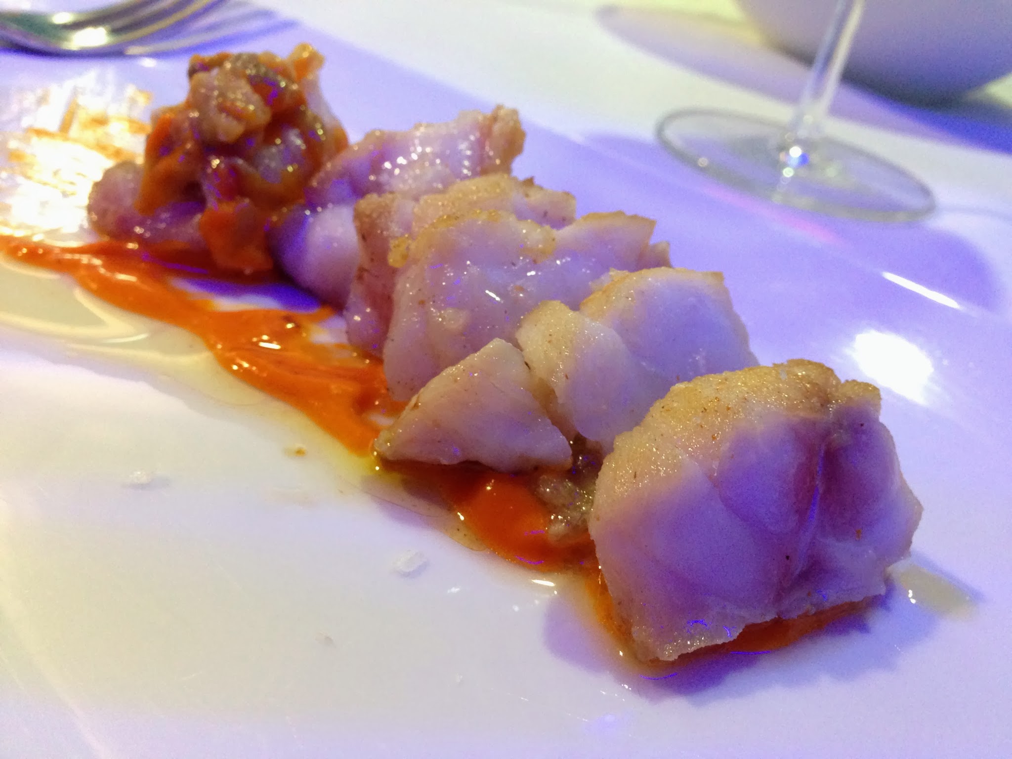 Luego ya de entrante nos pusieron uno de los platos estrella de la casa, la Ostra Gillardeau, que va cruda, envuelta en pepino y con un toque de ginebra Hendrick’s, un poco de yogur picante y lima. La ostra era de primera calidad y enorme, pero a mí el plato no me acabó de convencer, quizá porque no me apasiona el pepino, aunque me guste la ginebra. Gillardeau, por cierto, es uno de los más famosos cultivadores de ostras de Francia.
