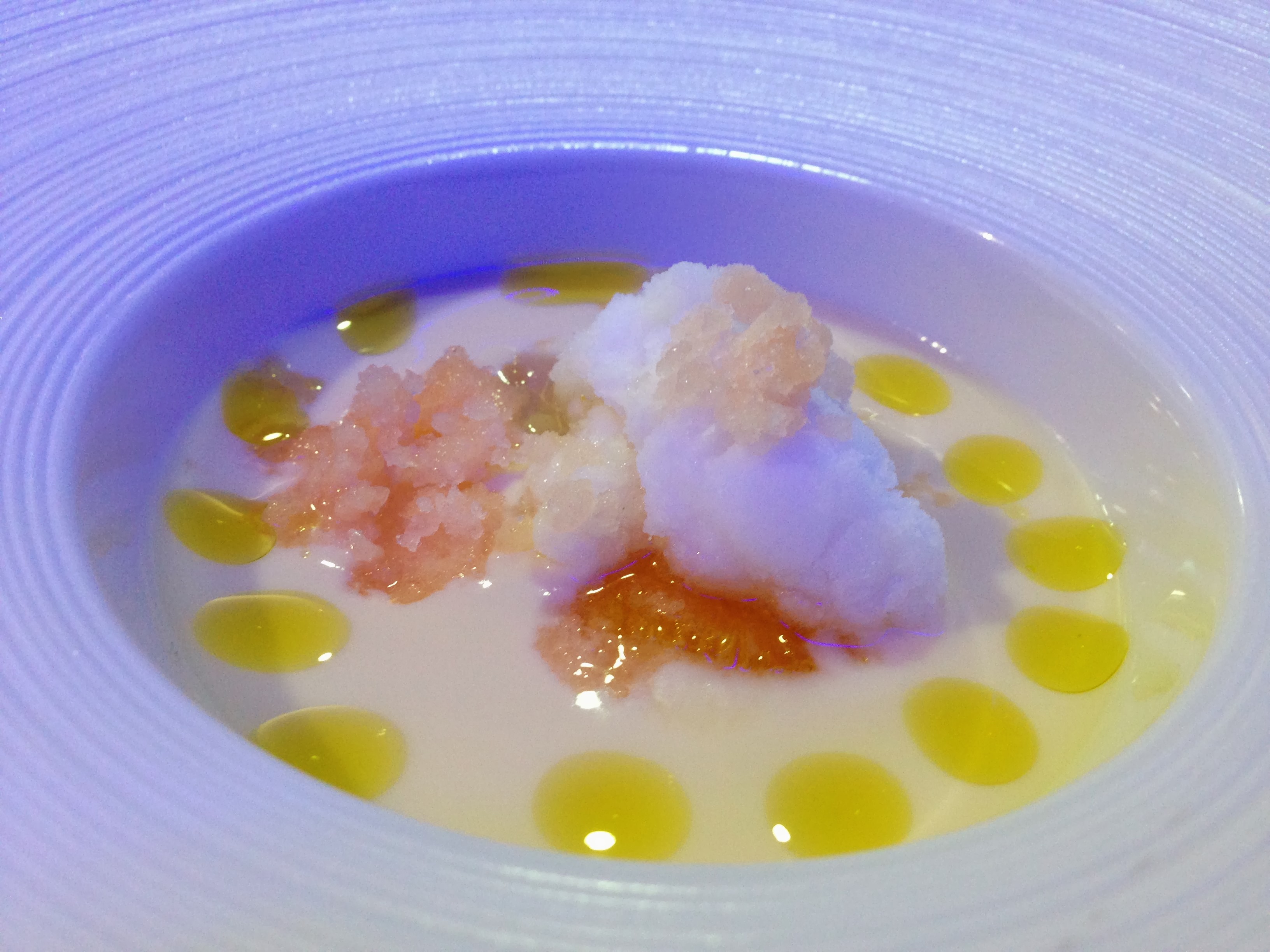 Por último el postre, una sopita de yogur con miel y sorbete de limón y pomelo. Todo un regocijo para los sentidos.