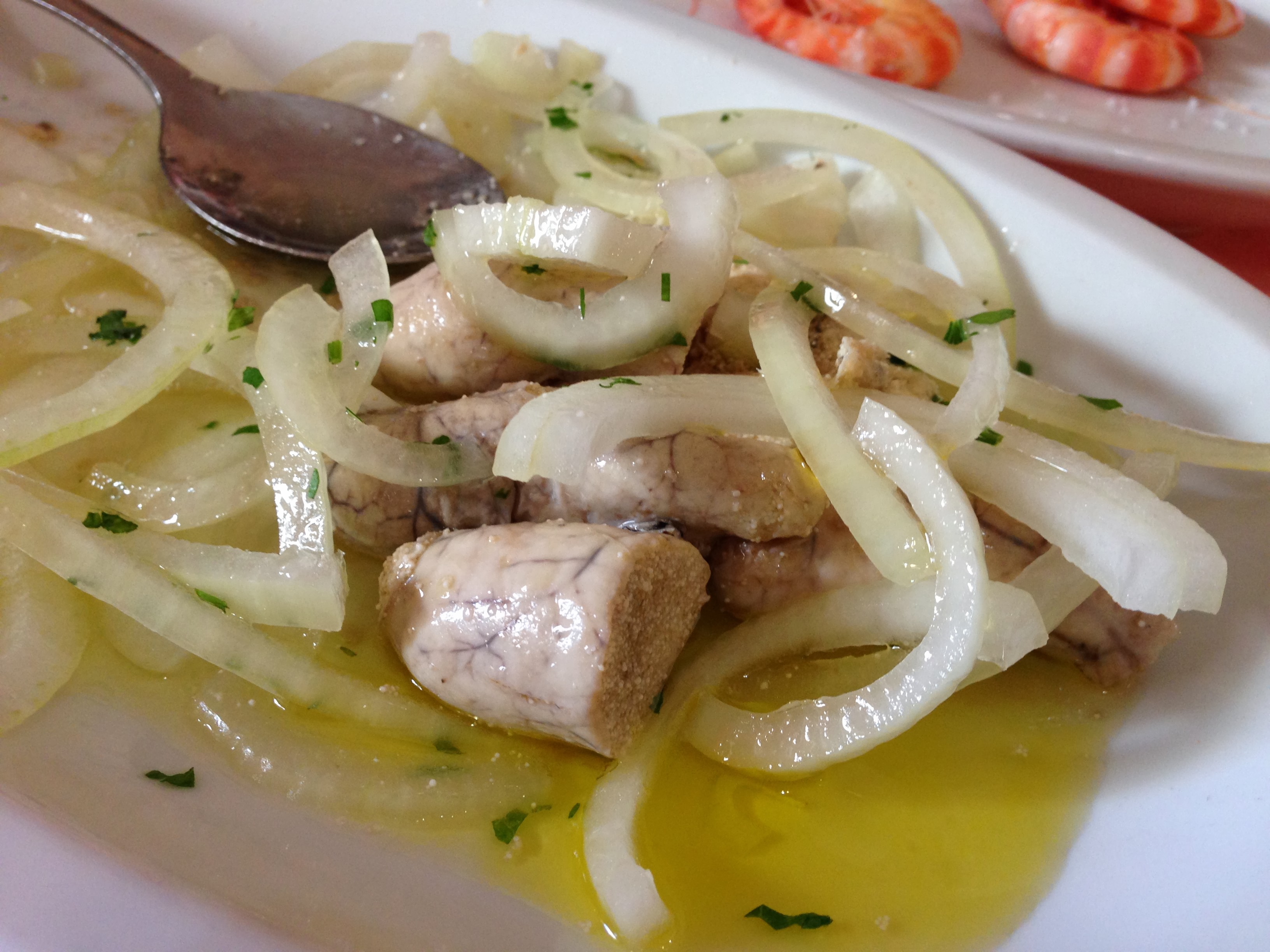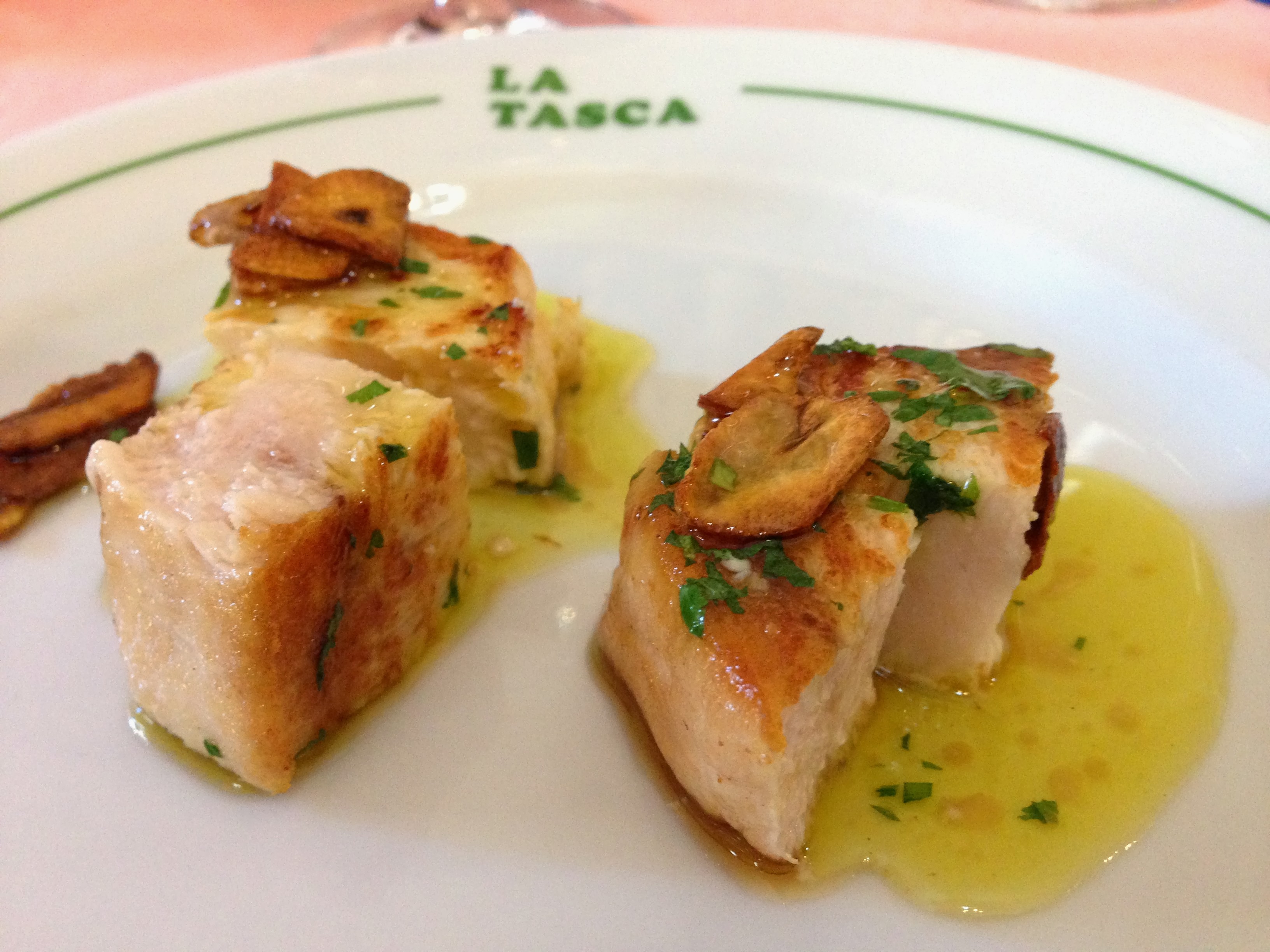 Tras esta avalancha de platos pedimos un par de segundos para compartir. Por un lado pez espada a la plancha con aceite y ajito. Estaba de muerte, porque le pedimos que nos pusiera ración doble, pero en el sentido de que lo cortara con doble grosor, con lo que quedó jugosito y en su punto. Nada que envidiarle al atún rojo que está tan de moda.