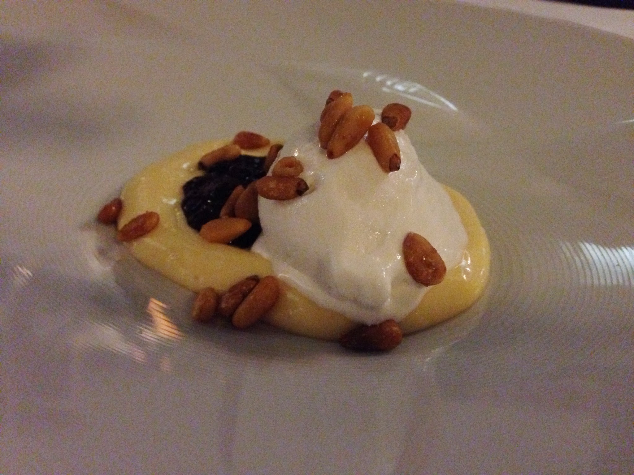 De postre pedimos un par de cosas diferentes, pero igualmente deliciosas. Uno era un pastel de chocolate caliente con frutos rojos y el otro un helado estupendo con crema y piñones, para chuparse los dedos.