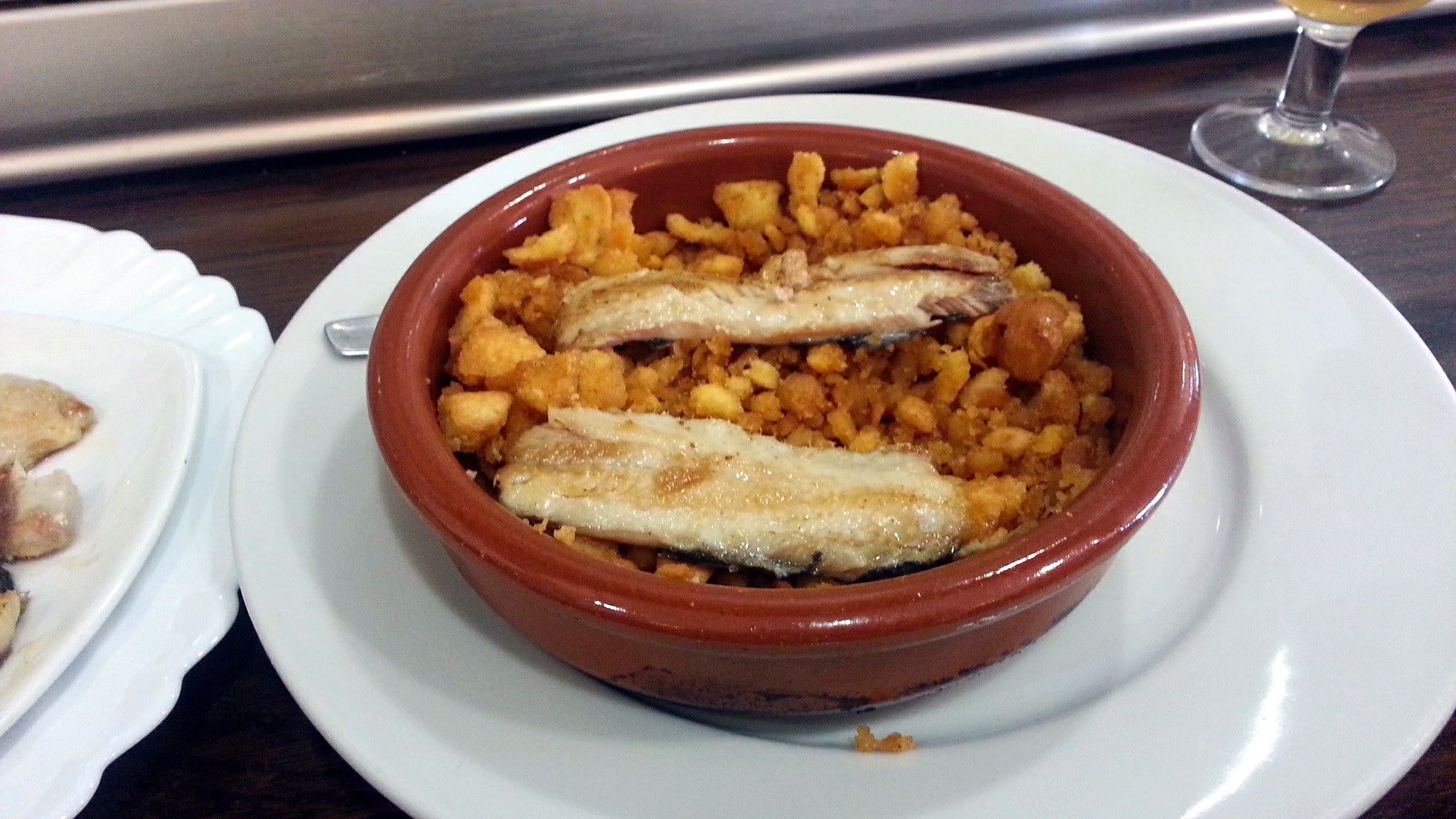Empezamos en la barra mientras llegaba el resto de la cuadrilla. Se calzan buenas tapas y además tienen tres mesas en la calle que para estos días tan espectaculares de primavera están genial. También tienen un montón de ofertas en la barra que son de esas que se te saltan las lágrimas. Por ejemplo, Botella de Rioja más ración de bravas y ración de oreja por 10€. O también tercío de Mahou 5 estrellas más plato de migas por 3,5€. Pedimos está última y nos marcharon un plato de migas estupendas acompañadas de unos boquerones a la plancha de lujo. Y generoso a más no poder. Por un lado venía la cazuela de migas y por otro el plato con 7 u 8 boqueronazos de buen calibre.