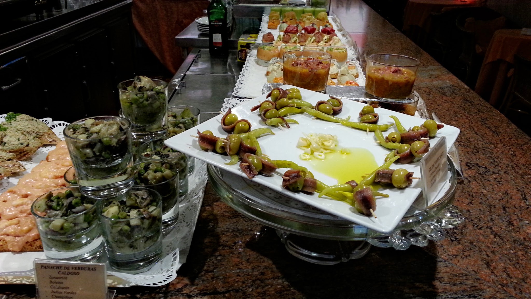 Así que en cuanto he tenido hueco he ido un sábado a mediodía y os aseguro que la barra es verdaderamente espectacular. Pinchos de calidad y para todos los gustos con precios que rondan los 2,5-3€. Desde guisos convencionales (potaje, lentejas, cocido…) a pinchos más sorprendentes como el Miguelito (dátil, albahaca, granada y anchoa), pasando por pinchos de toda la vida como la excelente tortilla de patatas, cóctel de gambas, ensaladilla rusa, salmorejo, etc. Aproximadamente, yo creo que habrá unos 25-30 pinchos diferentes.