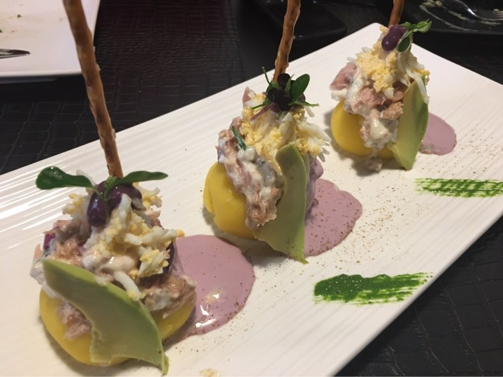 Después, causita limeña. Es un clásico de la cocina peruana que no podíamos dejar de probar. Muy buena. Para el que no la conozca, mi padre la definió como una ensaladilla sin mezclar. Y es lo que es! Eso sí, con su ají amarillo y acompañado de la sala de aceituna peruana Botija. Una delicia.